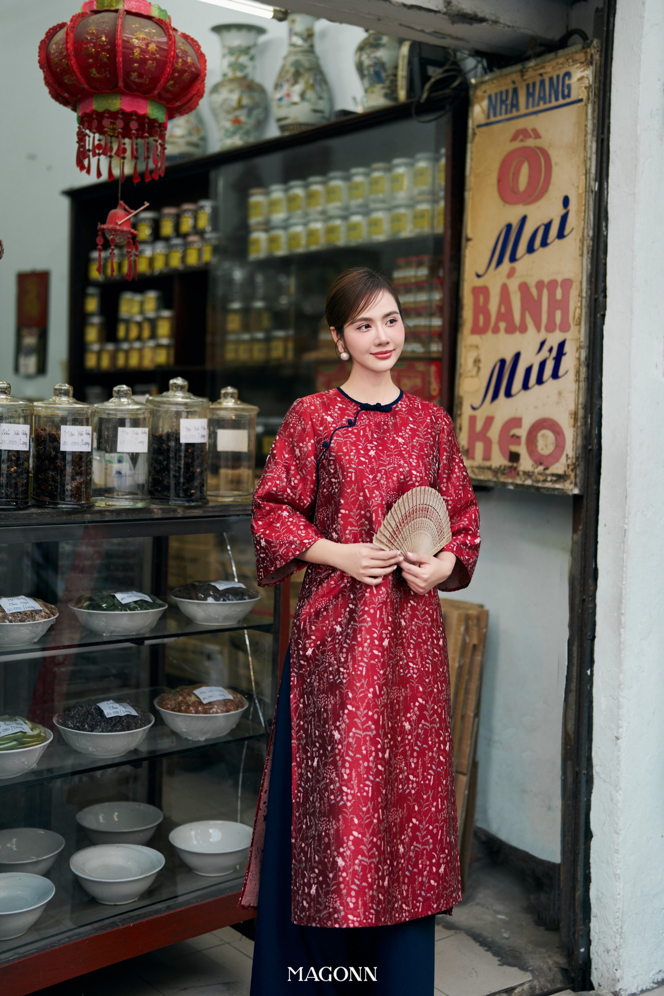 * Kiểu dáng: Áo dài dáng suông, tay lửng, cổ tròn, đính nút lệch