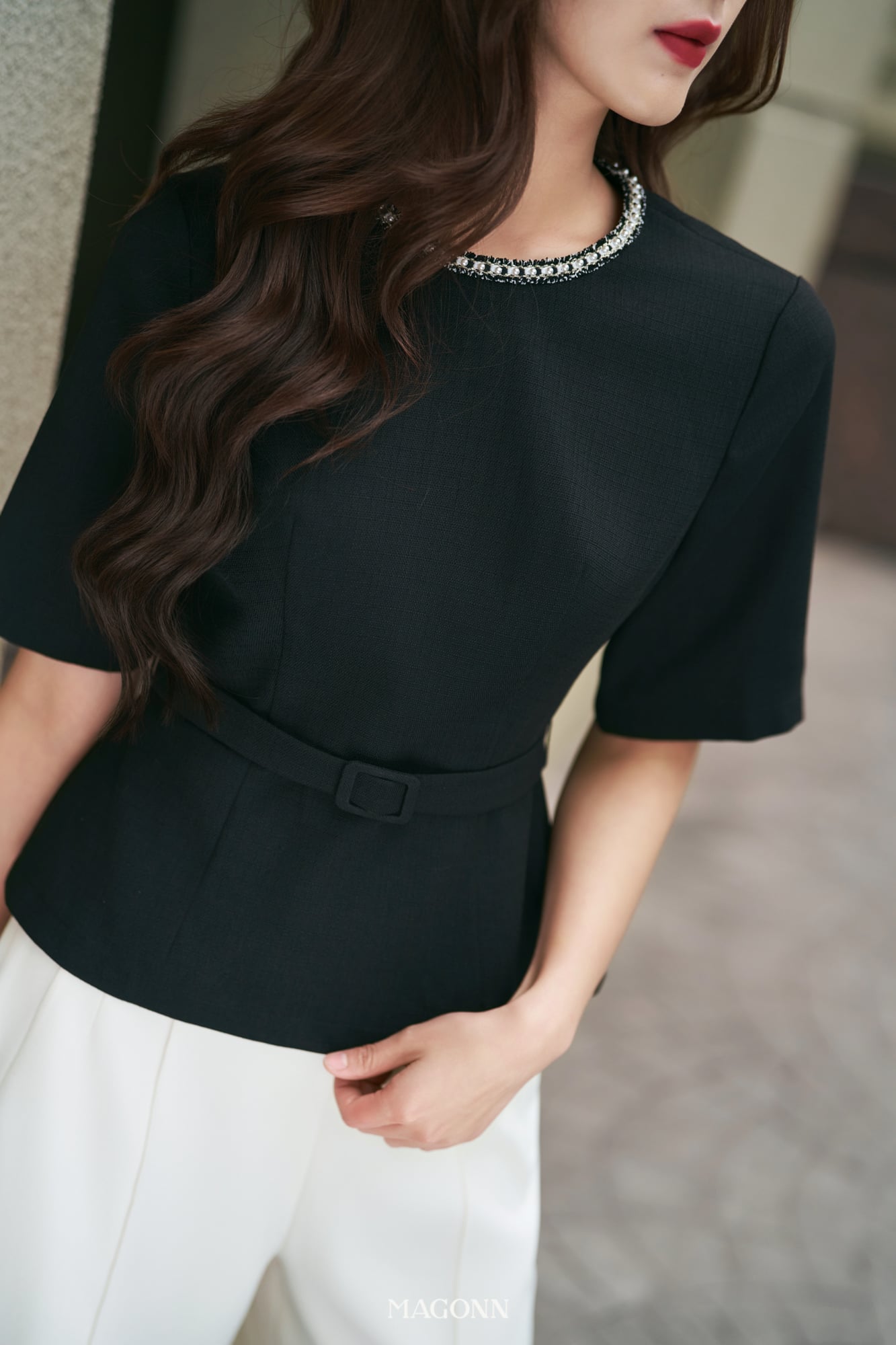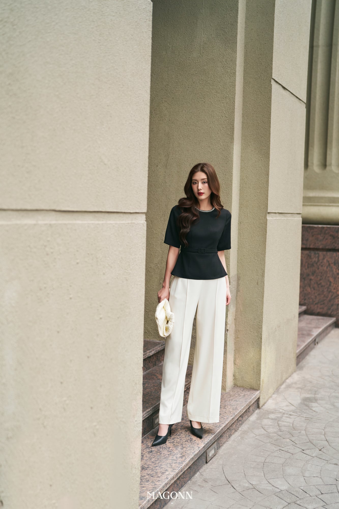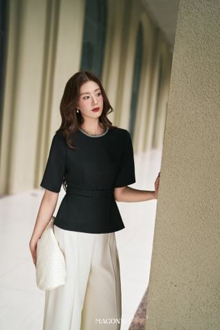 * Kiểu dáng: Áo kiểu, chiết eo, cổ tròn, tay ngắn, kèm đai
