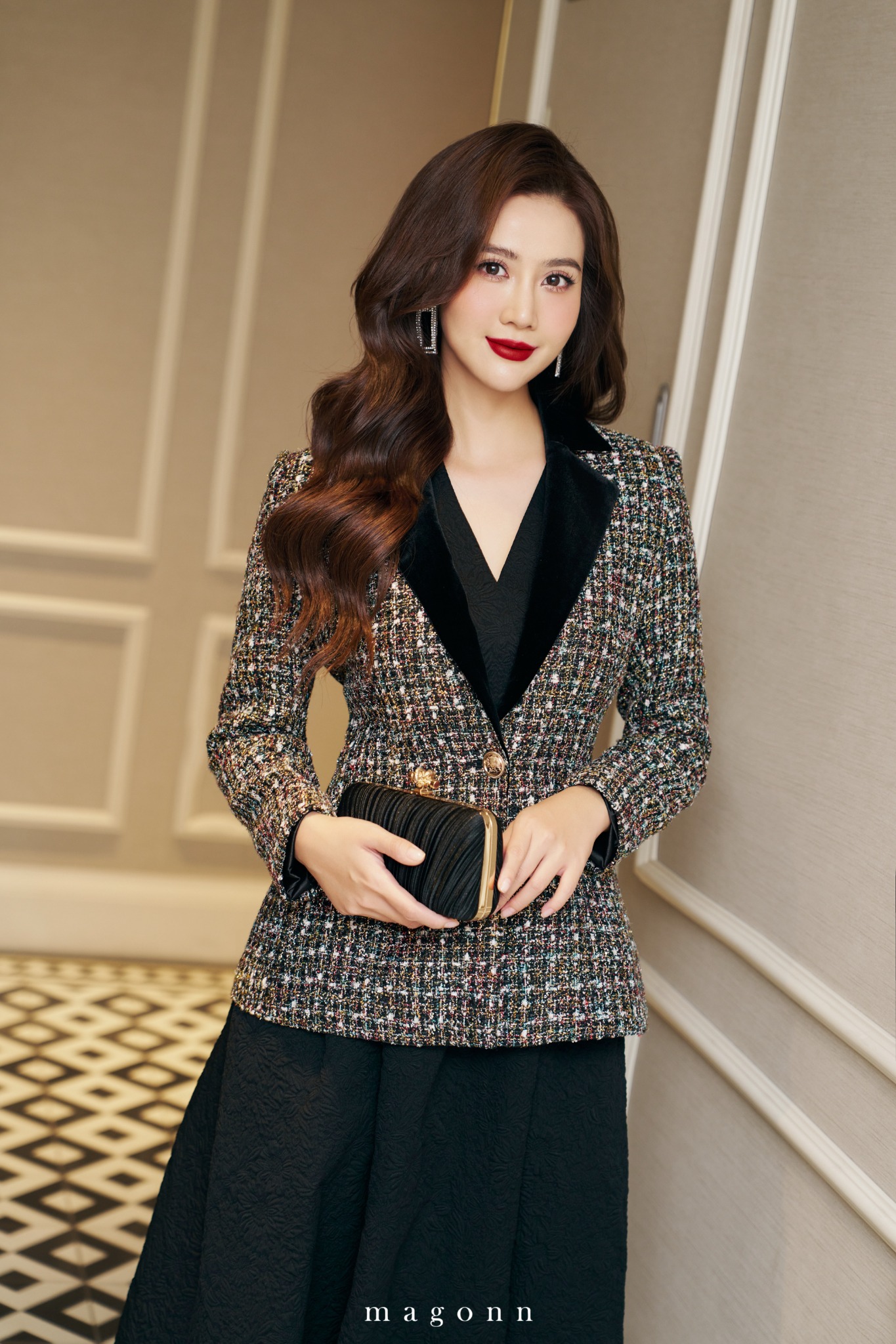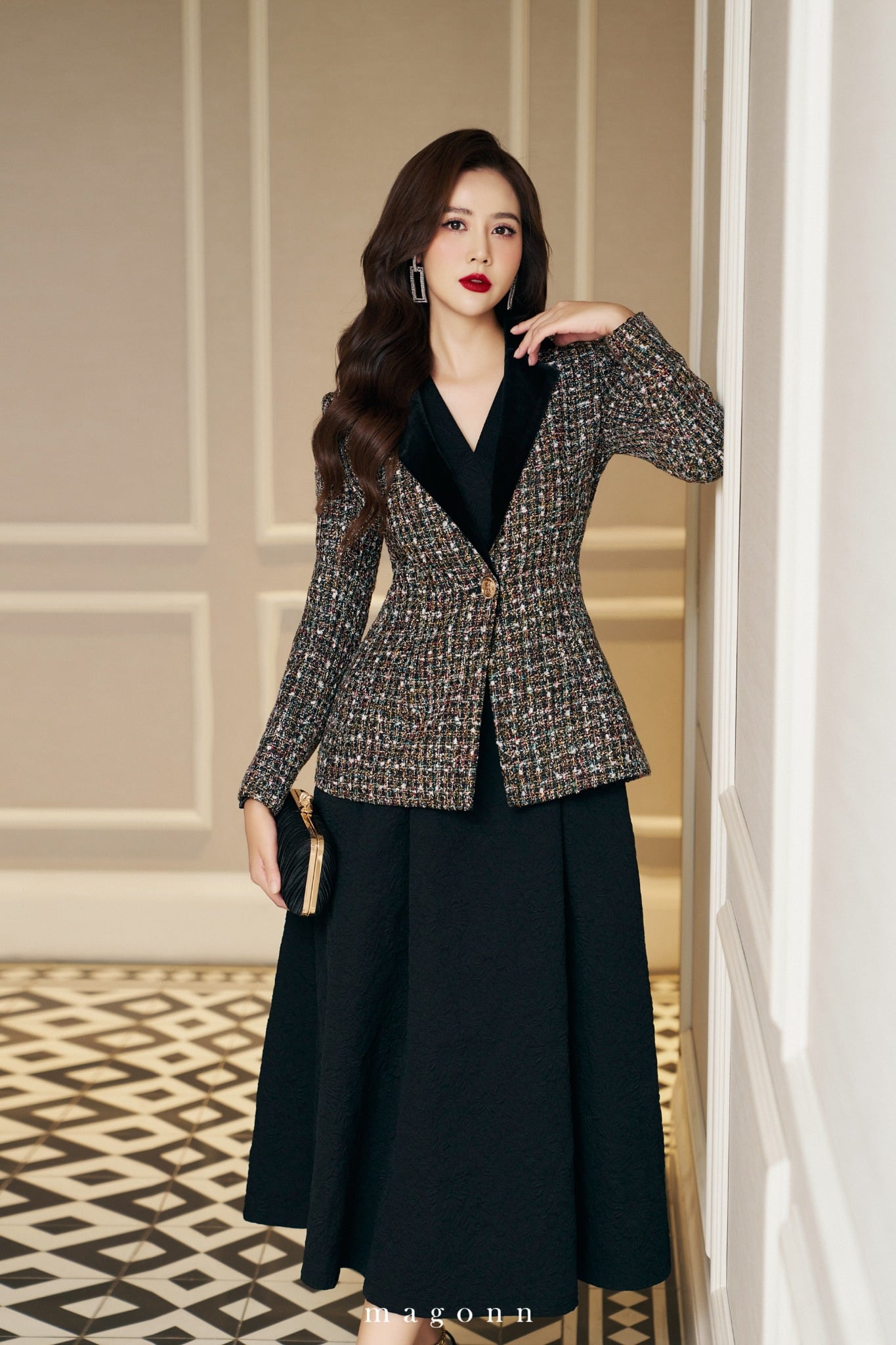 | * Kiểu dáng: Áo vest dáng ôm, phom đứng, tay dài * Chất liệu: Dạ Tweed * Màu sắc: Nhũ đen phối cổ nhung '#### LƯU Ý: - FREESHIP cho đơn hàng Online giá trị từ 2.000.000đ. - Magonn không hỗ trợ xem hàng. - Khách hàng giữ lại hóa đơn cùng tag giá và mác dệt sản phẩm để được hỗ trợ trong trường hợp muốn đổi hoặc sửa với hàng Nguyên Giá. - Hàng giảm giá không áp dụng đổi hàng và không áp dụng chỉnh sửa. - Các sản phẩm đã thanh toán không được hoàn lại tiền vì bất cứ lý do nào. - Thông tin chi tiết về chính sách đổi/sửa xem tại: https://magonn.com/pages/chinh-sach-mua-hang Thông tin thêm về số lượng tồn sản phẩm liên hệ hotline: 0888482886 |