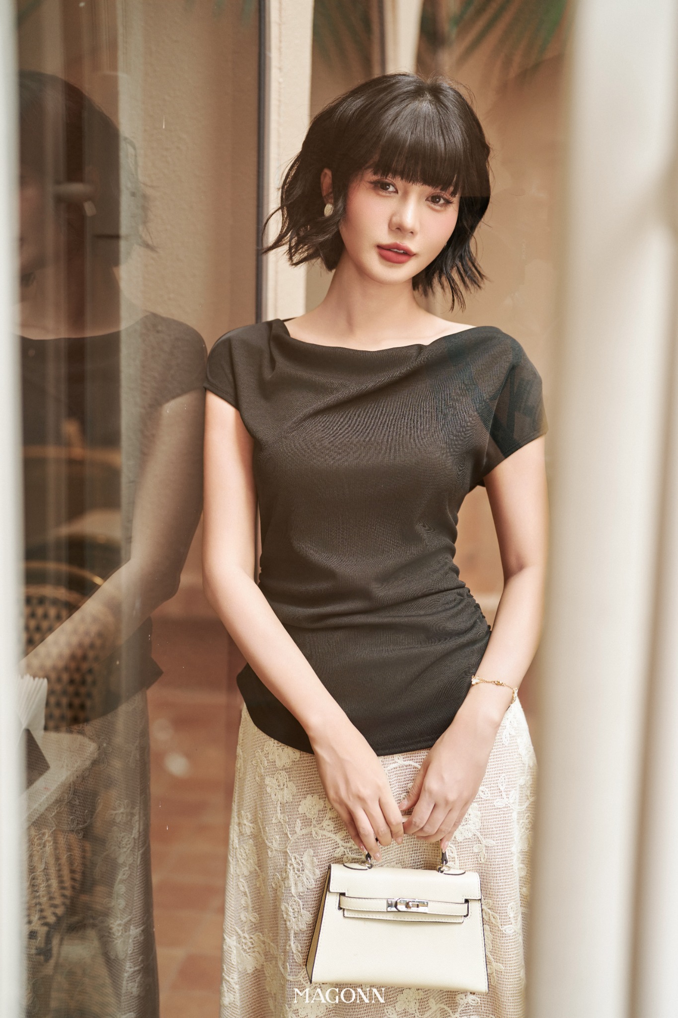 * Kiểu dáng: Áo ôm, cổ thuyền, tay ngắn
