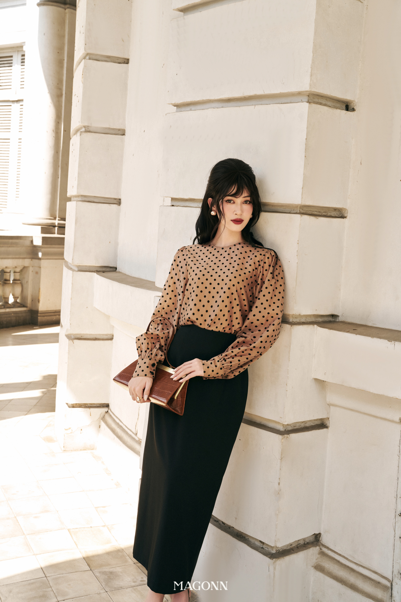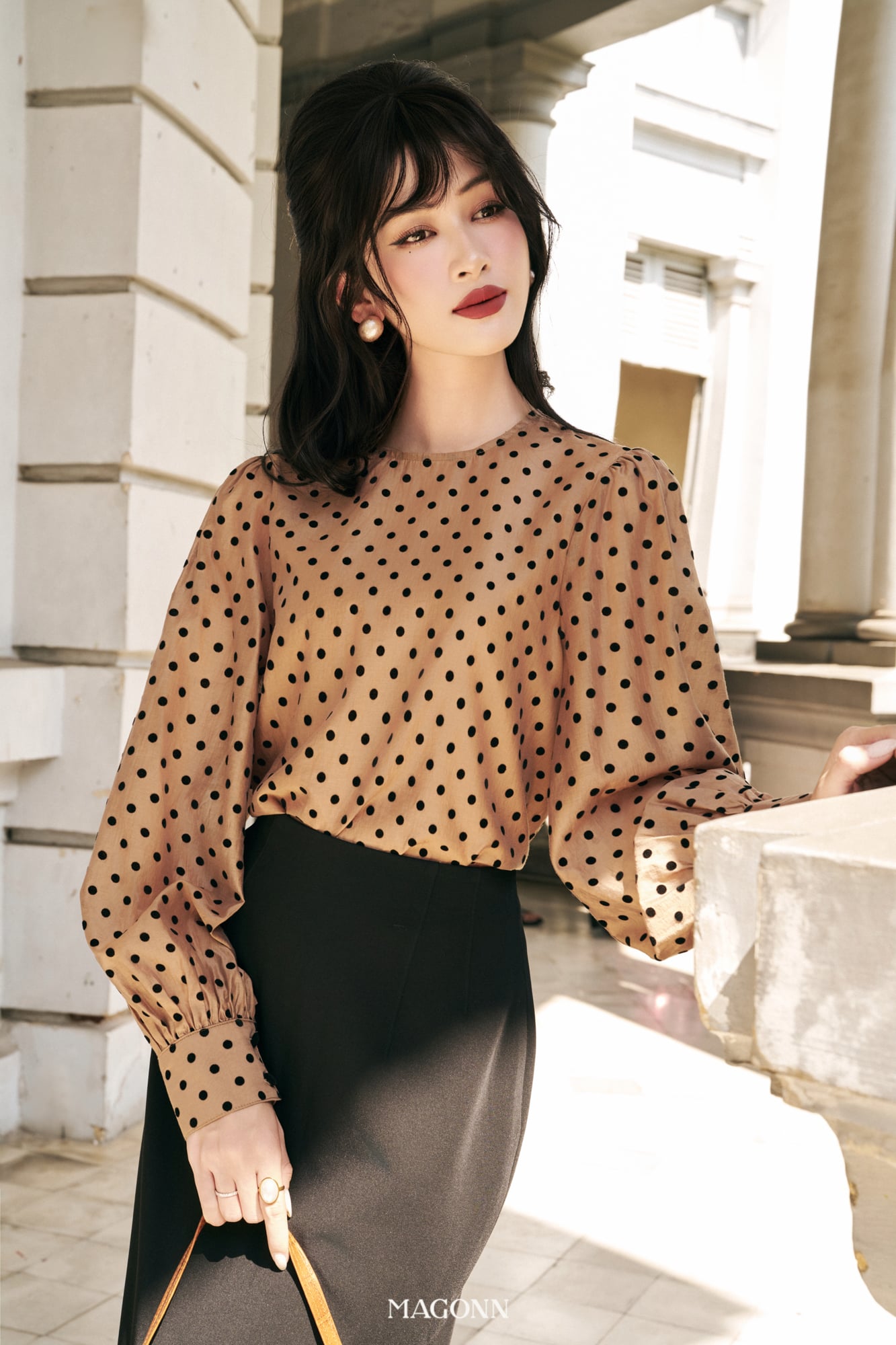 * Kiểu dáng: Áo dáng suông, cổ tròn, tay dài bồng nhẹ