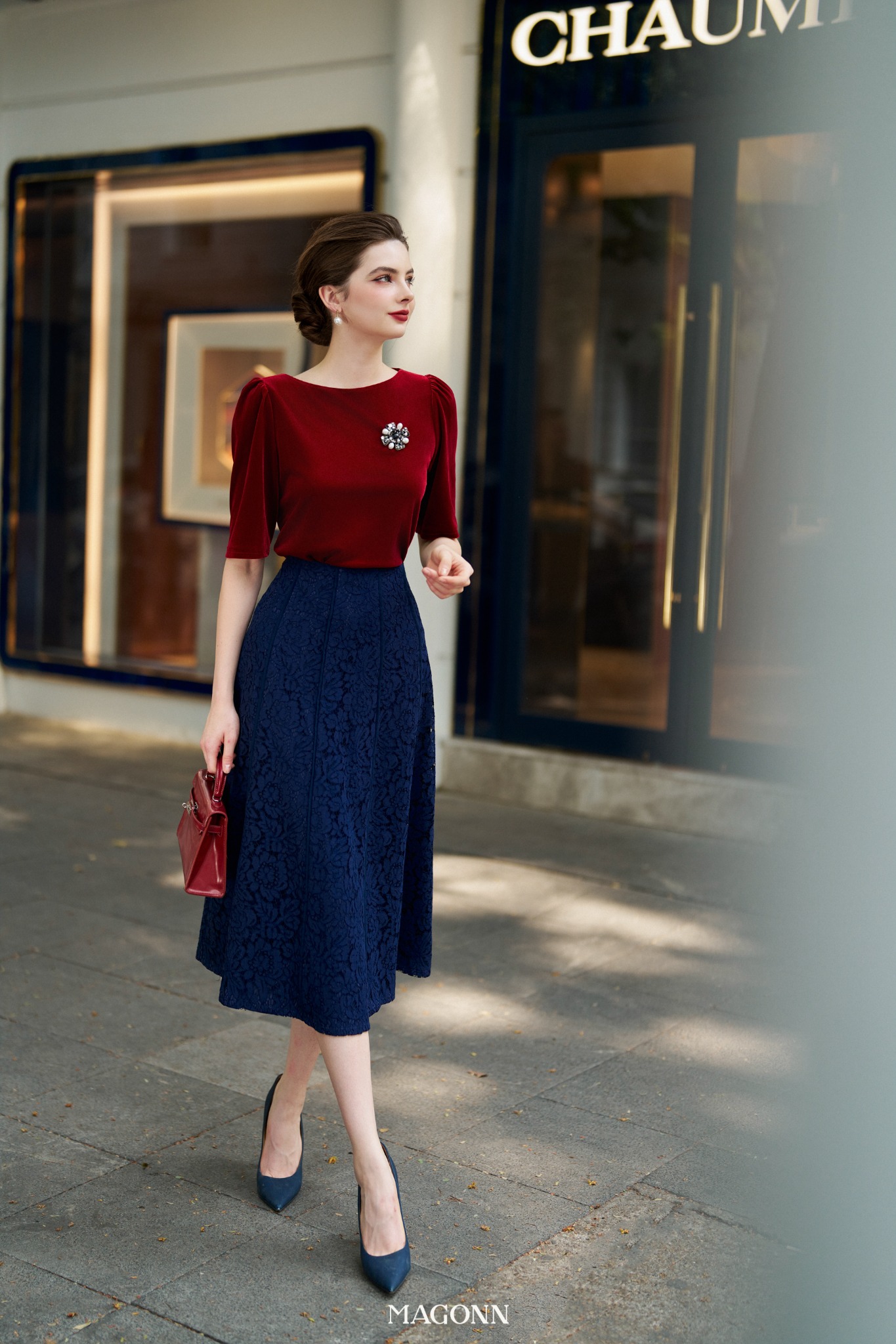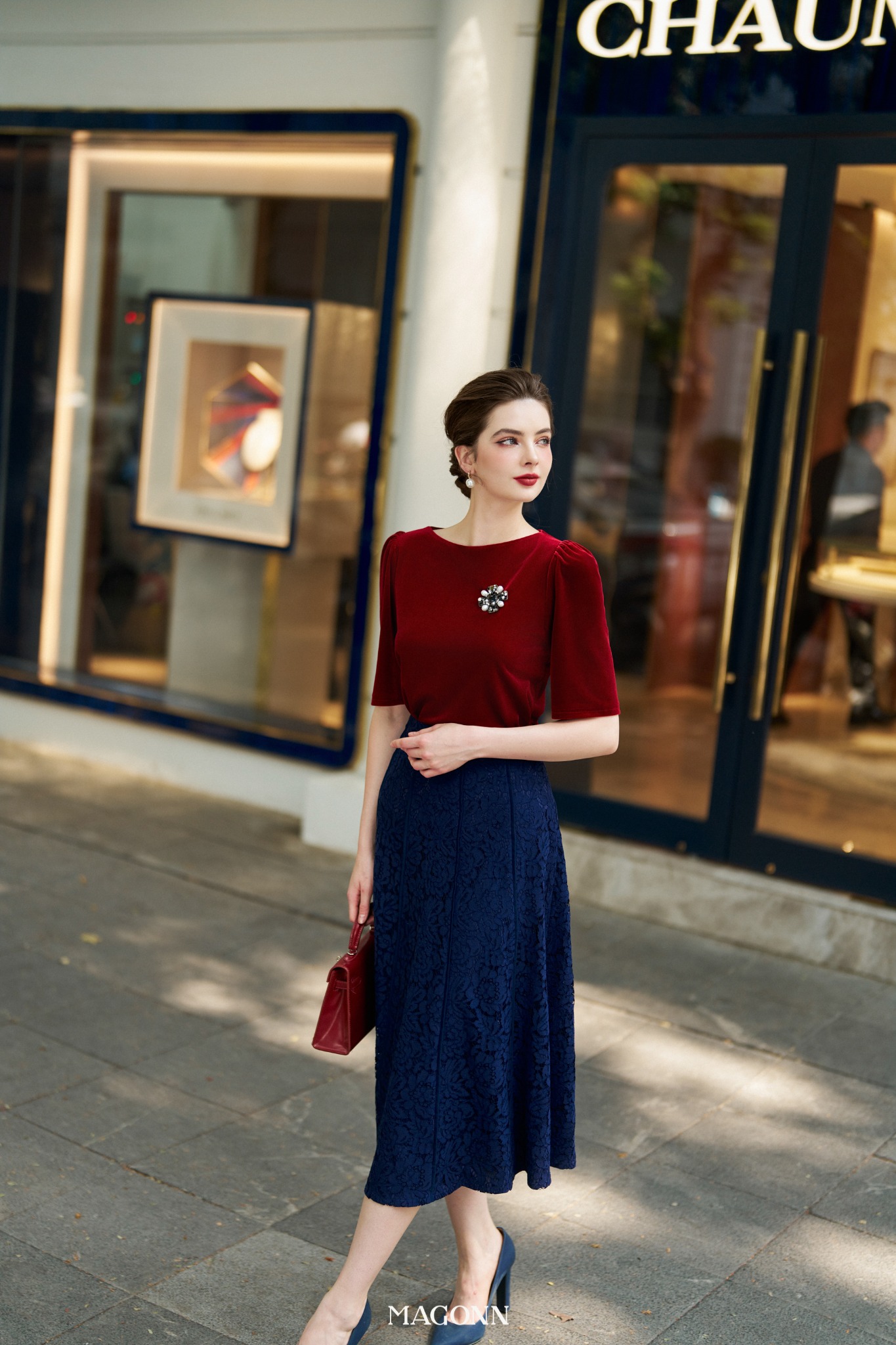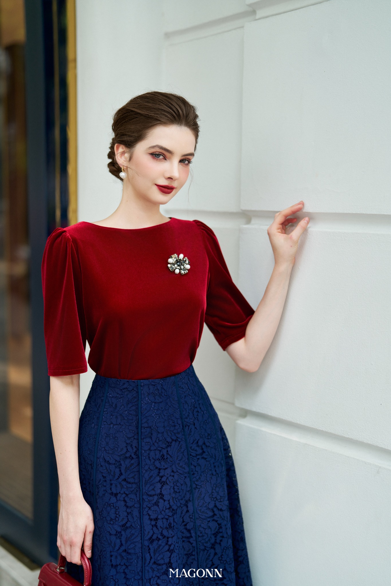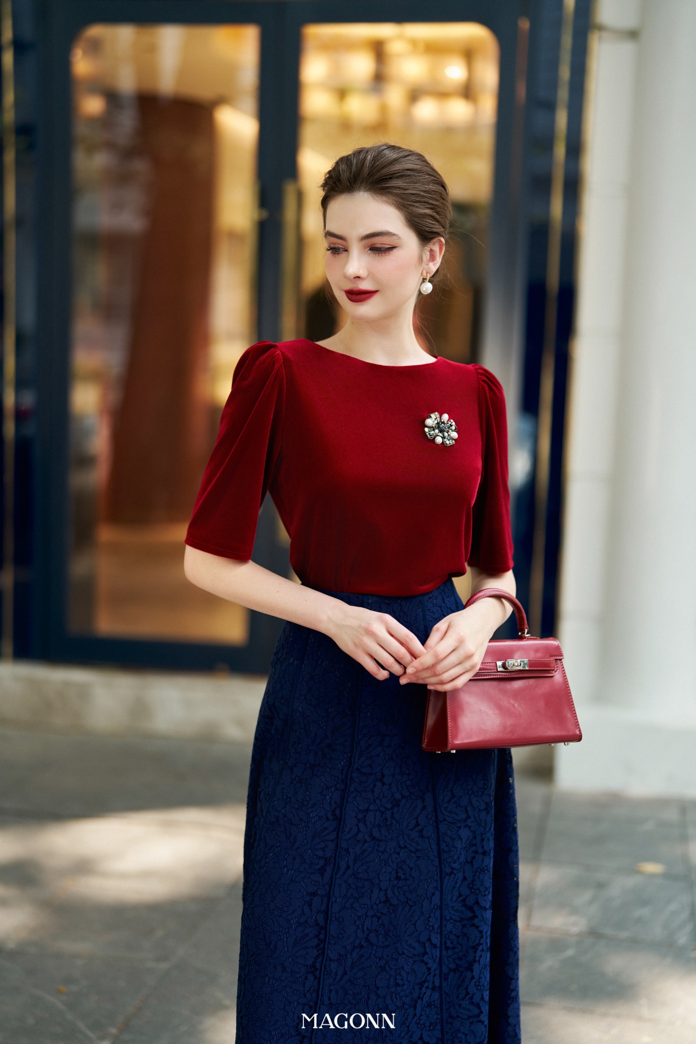 * Kiểu dáng: Áo cổ thuyền, vai bồng nhẹ, tay ngắn, áo dáng vừa