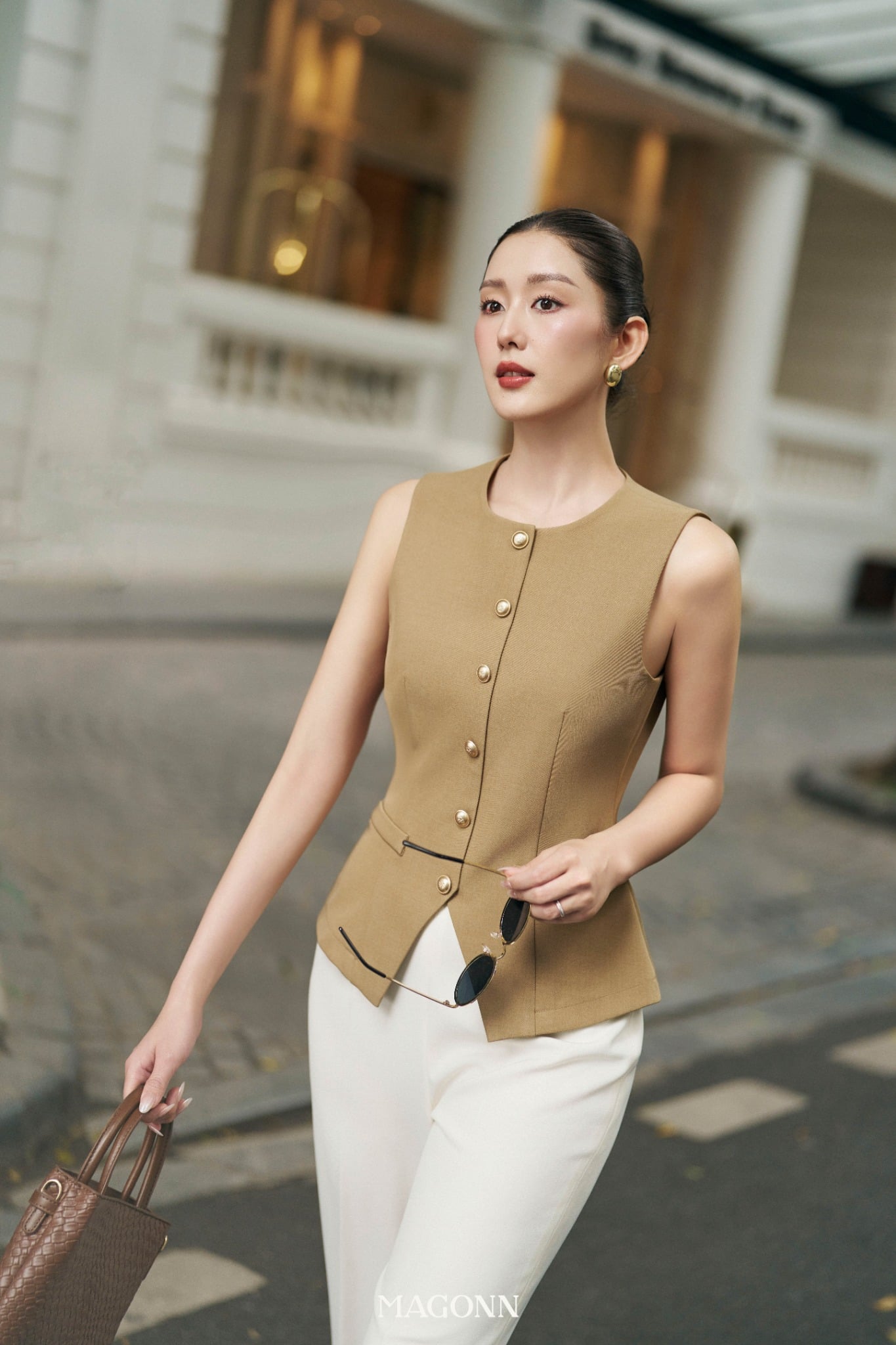 * Kiểu dáng: Áo ký giả, sát nách, chiết eo
