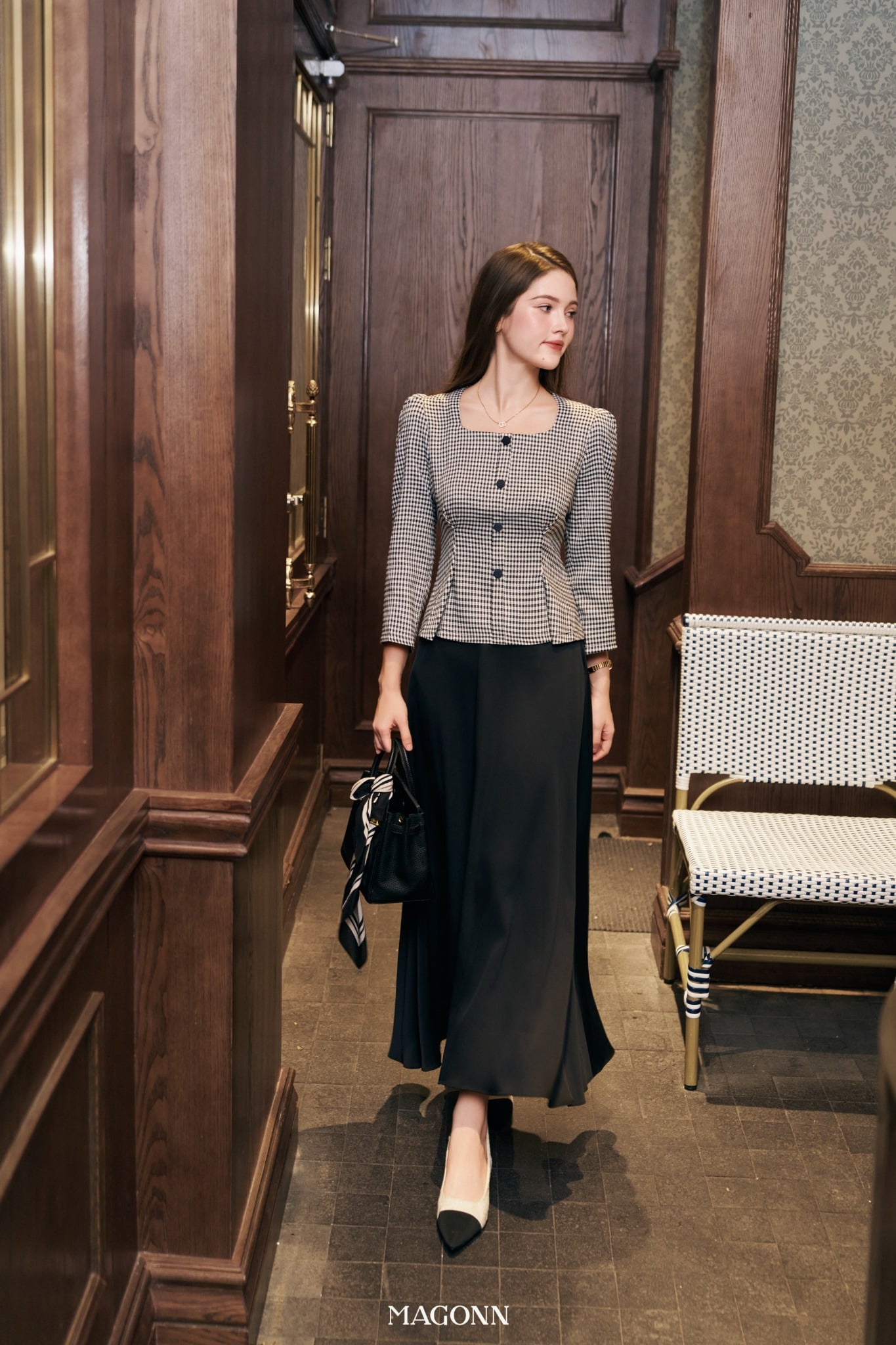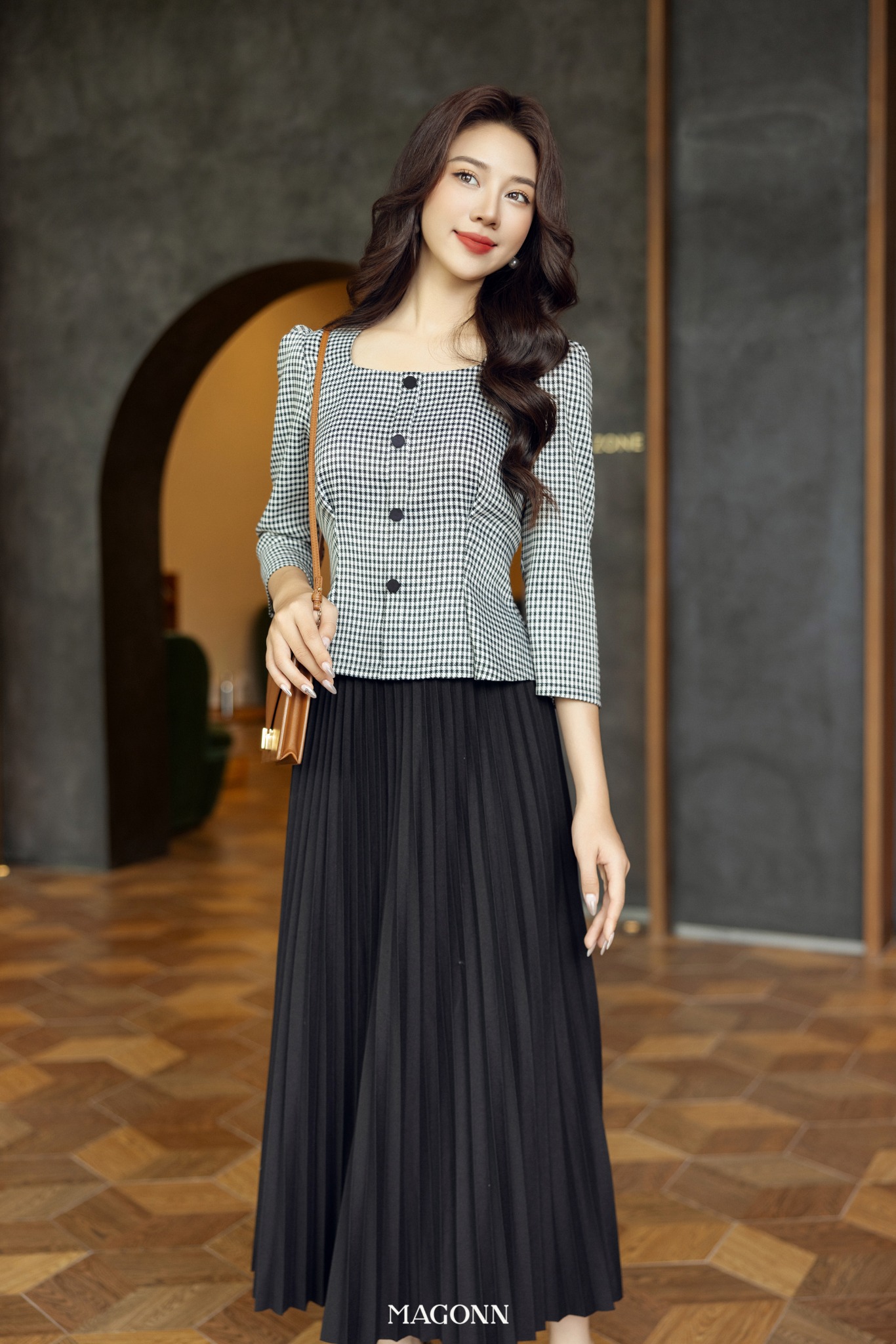 * Kiểu dáng: Áo công sở, chiết eo, cổ vuông, tay lửng