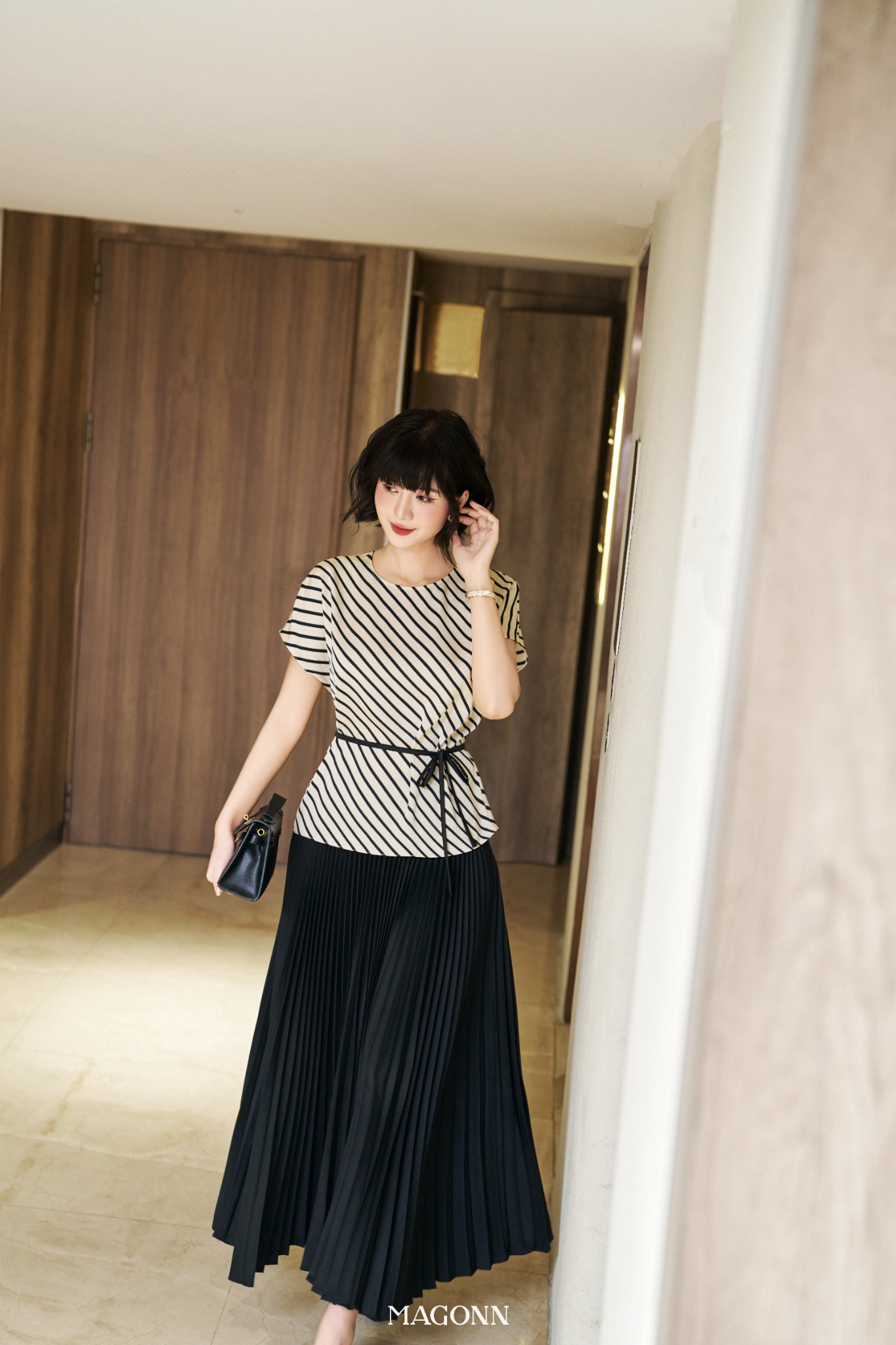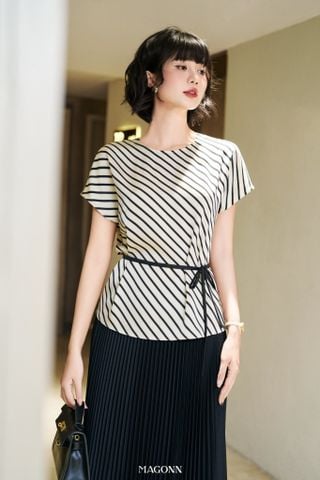 * Kiểu dáng: Áo cổ tron, tay ngắn, kèm đai chiết eo