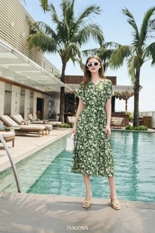 * Kiểu dáng: Váy dáng suông, tay ngắn, cổ V, kèm đai rời