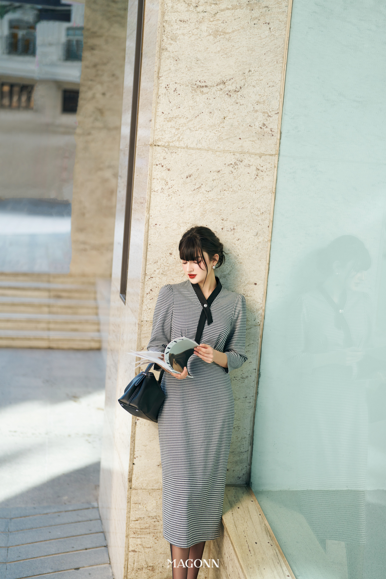* Kiểu dáng: Váy dáng dài, chiết eo, tay dài, cổ phối cách điệu