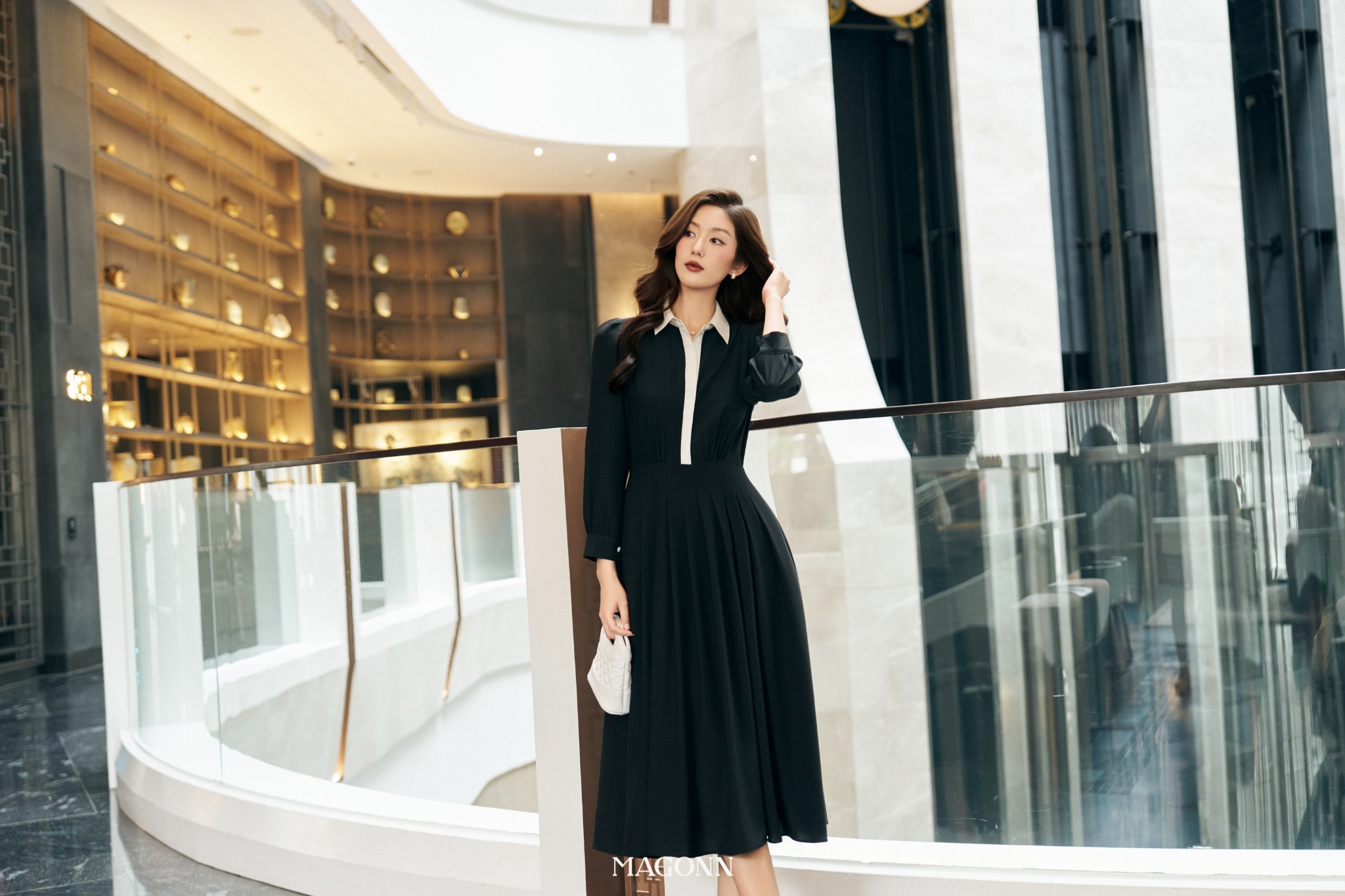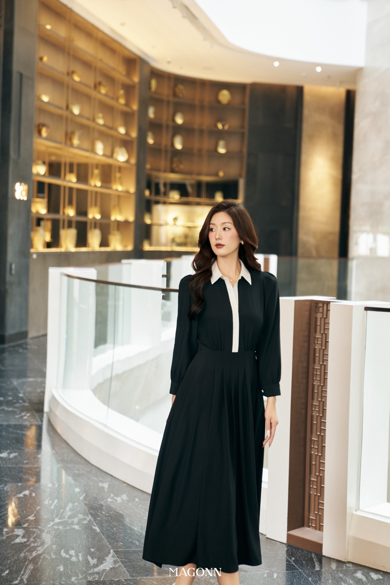 * Kiểu dáng: Váy dáng dài, chiết eo, cổ đức, chân váy xếp ly