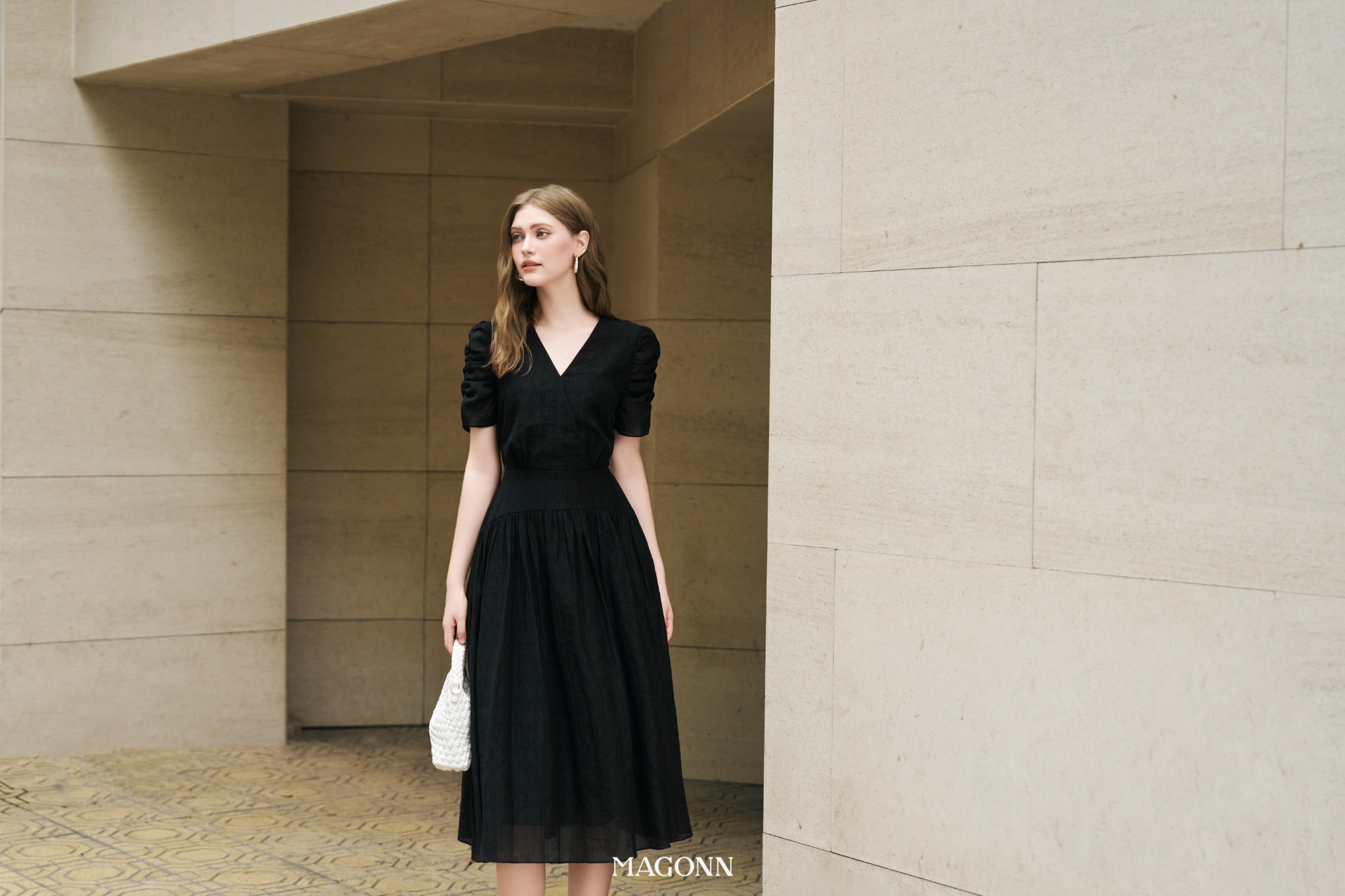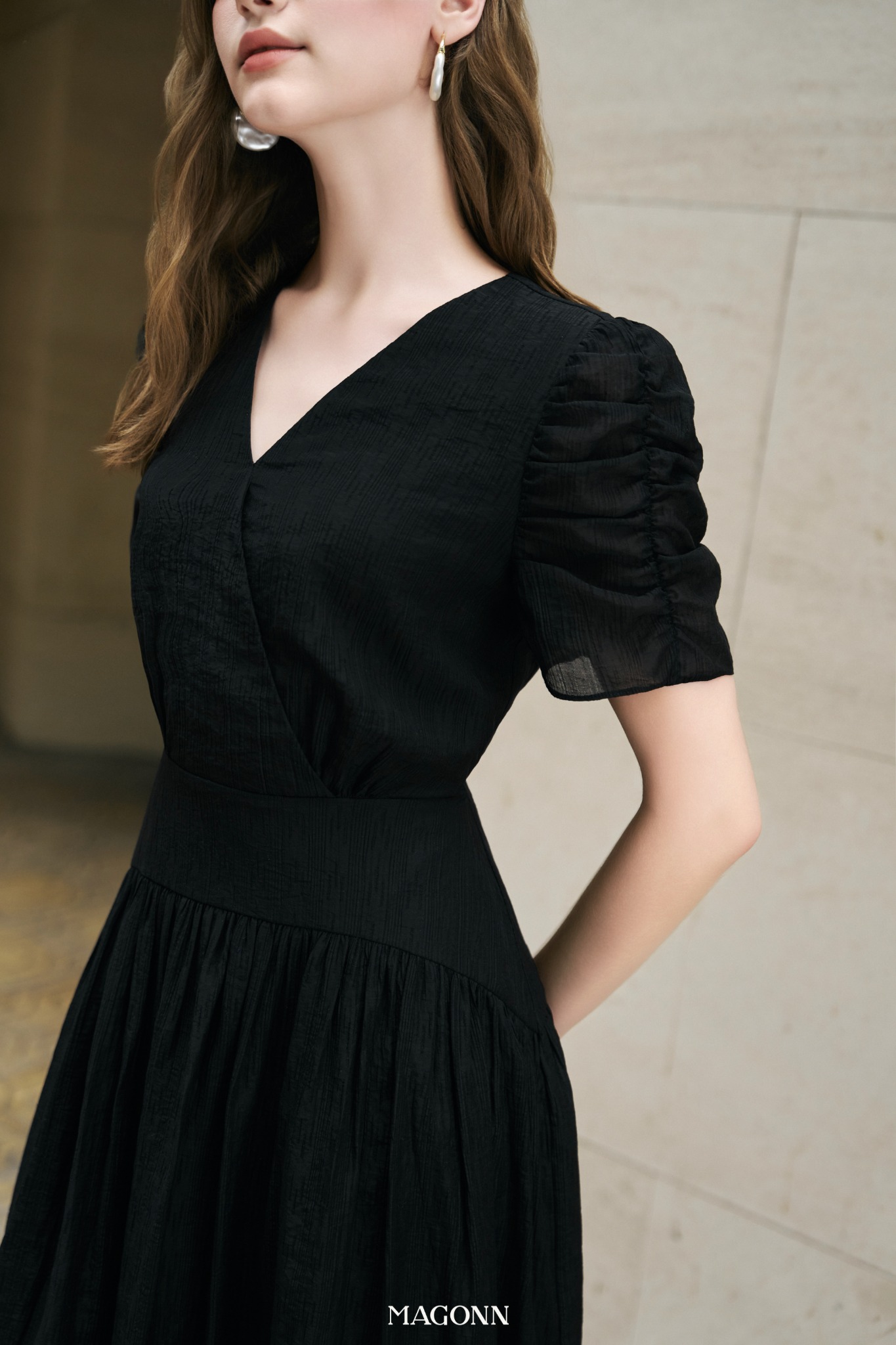 * Kiểu dáng: Váy chiết eo, cổ V, tay rút nhún