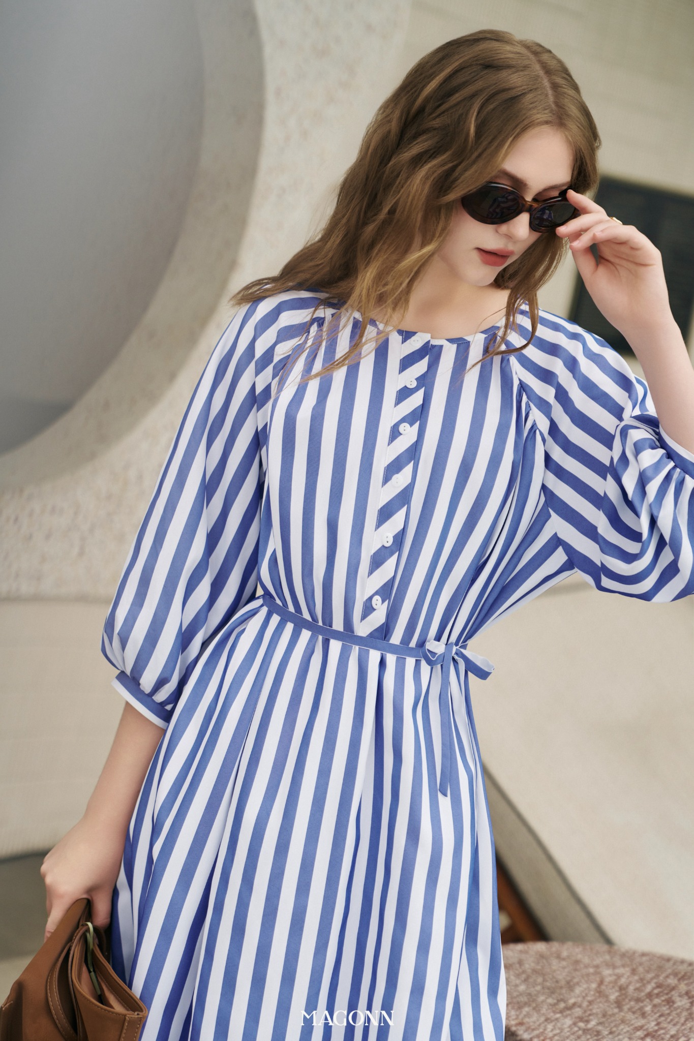 * Kiểu dáng: Váy dáng suông, tay lửng, cổ tròn, đai rời