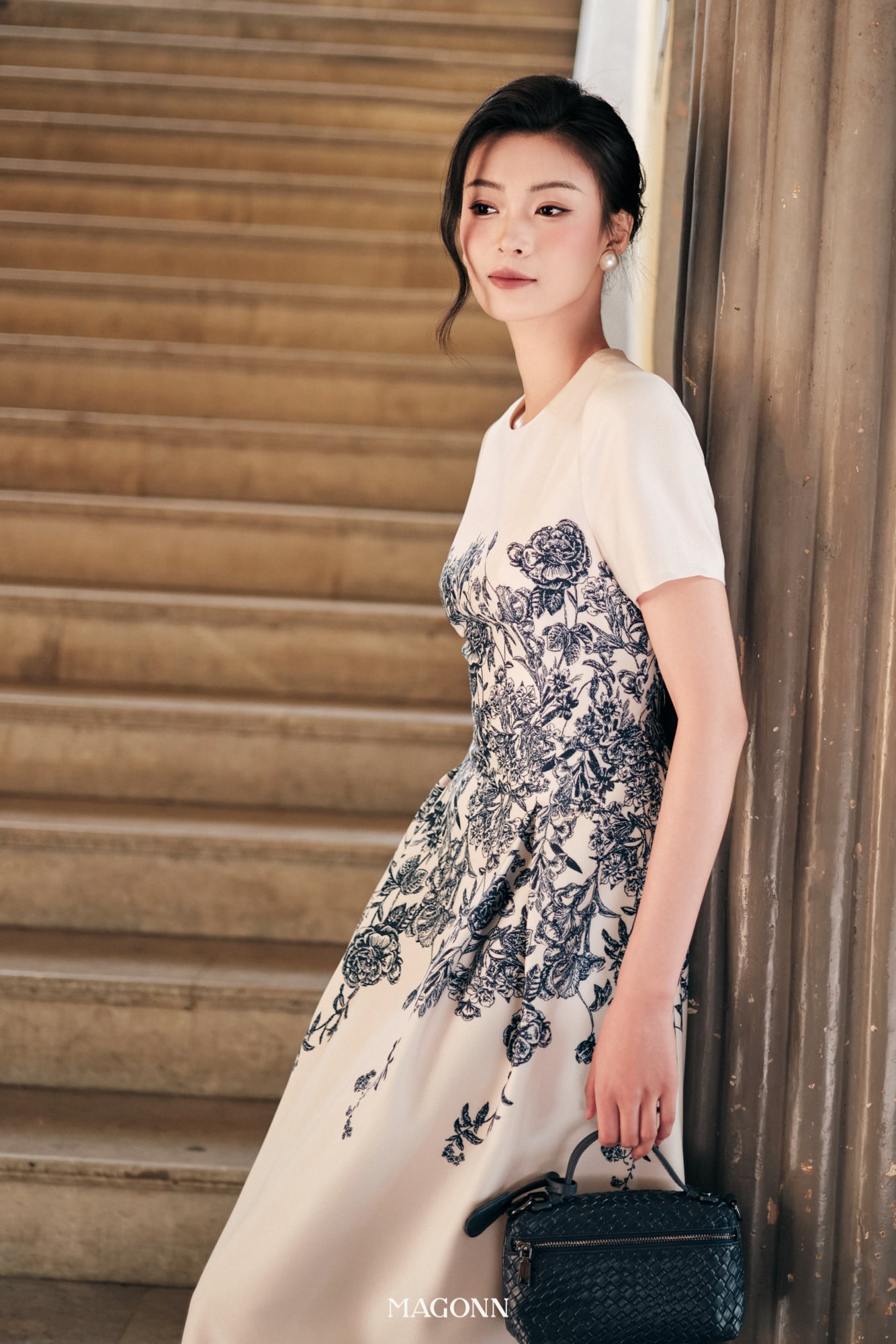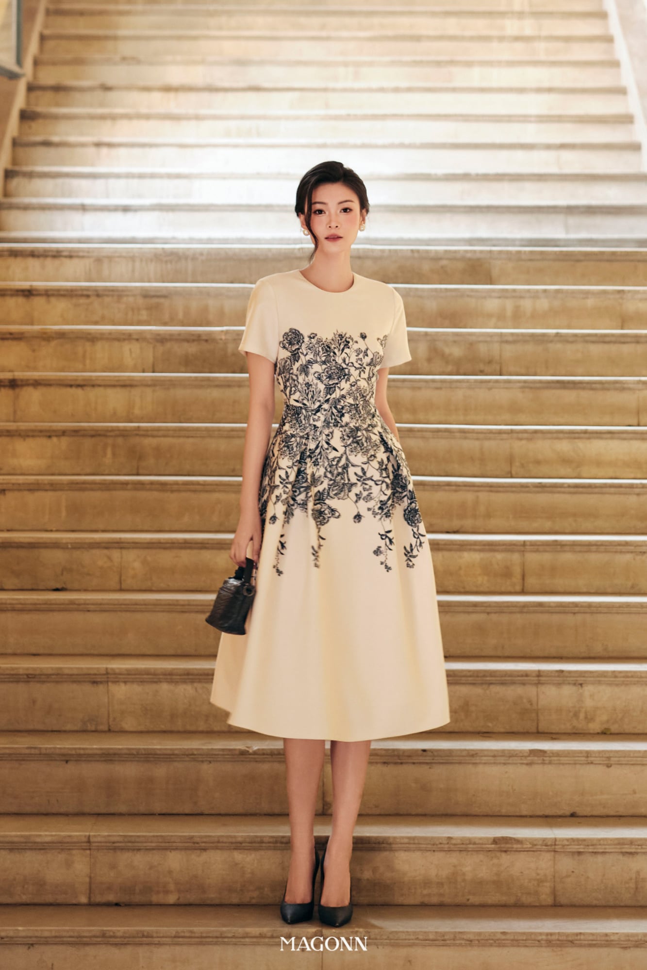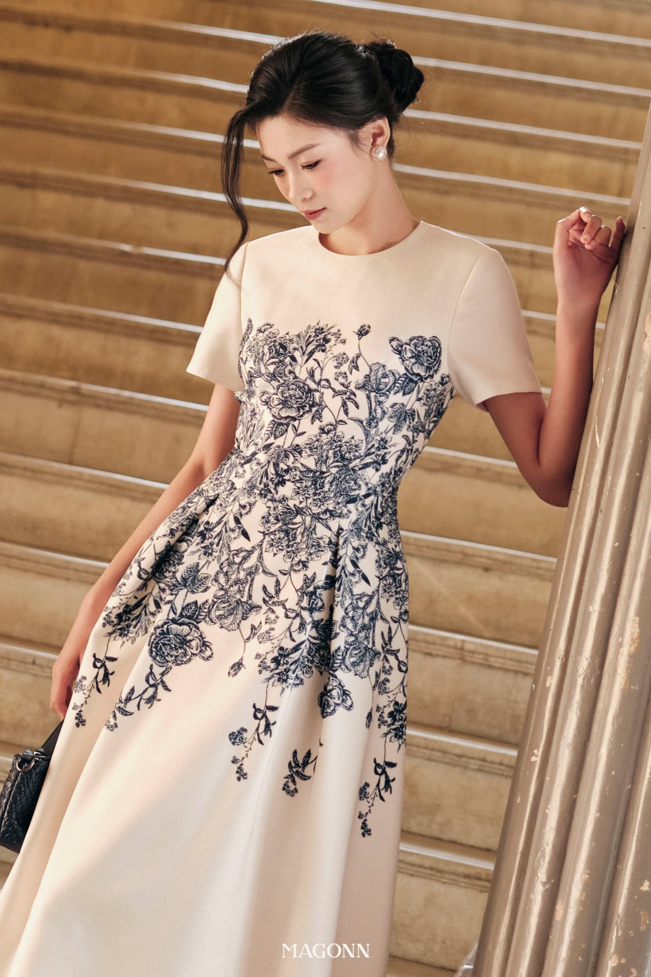* Kiểu dáng: Váy dáng dài, chiết eo, cổ tròn, tay ngắn