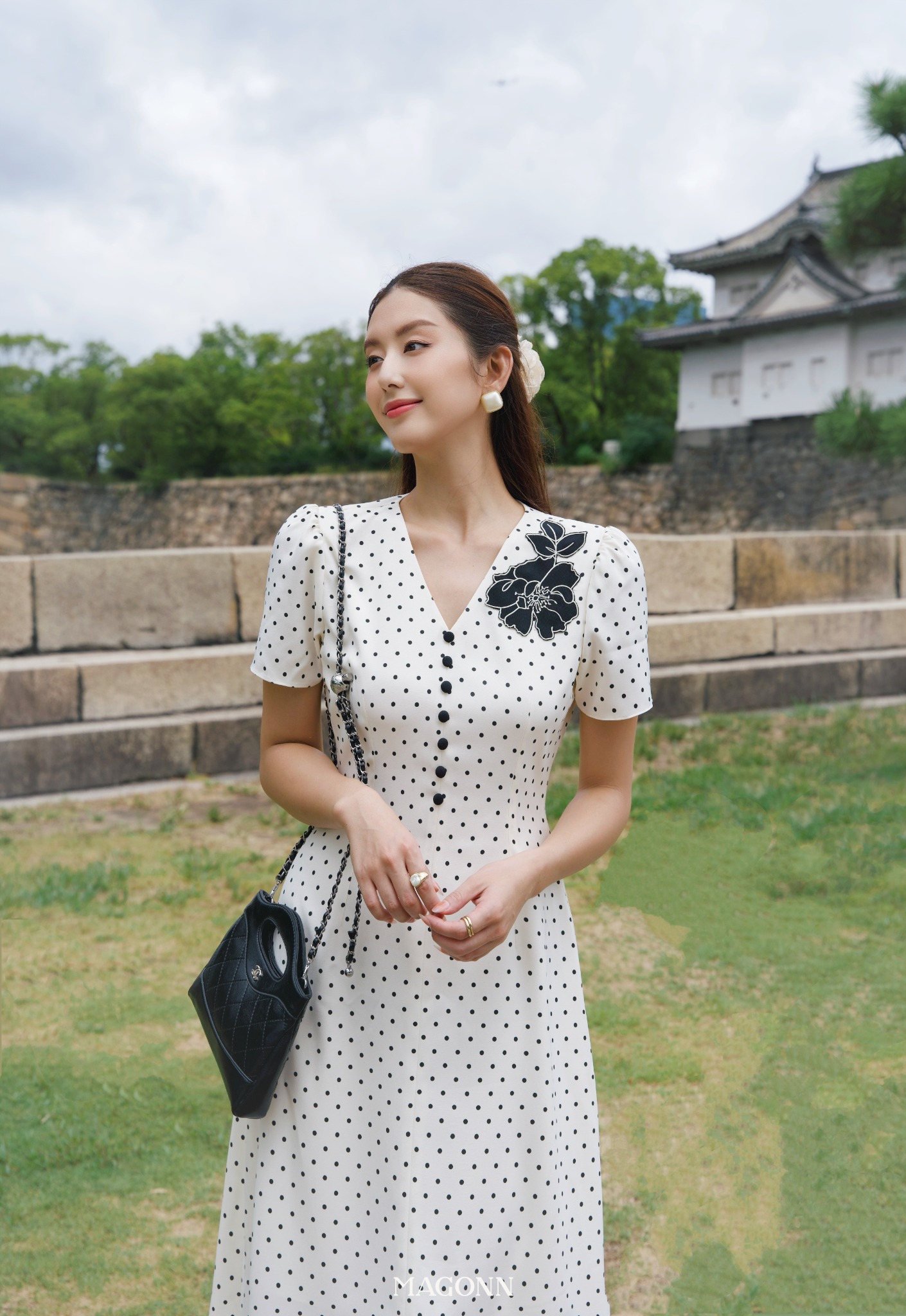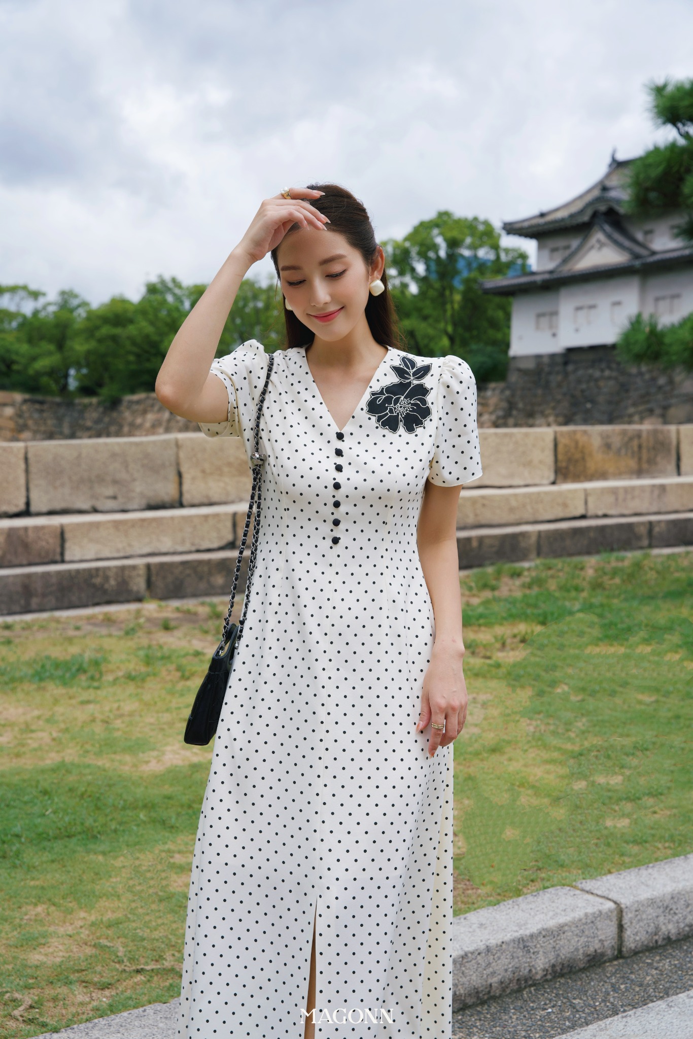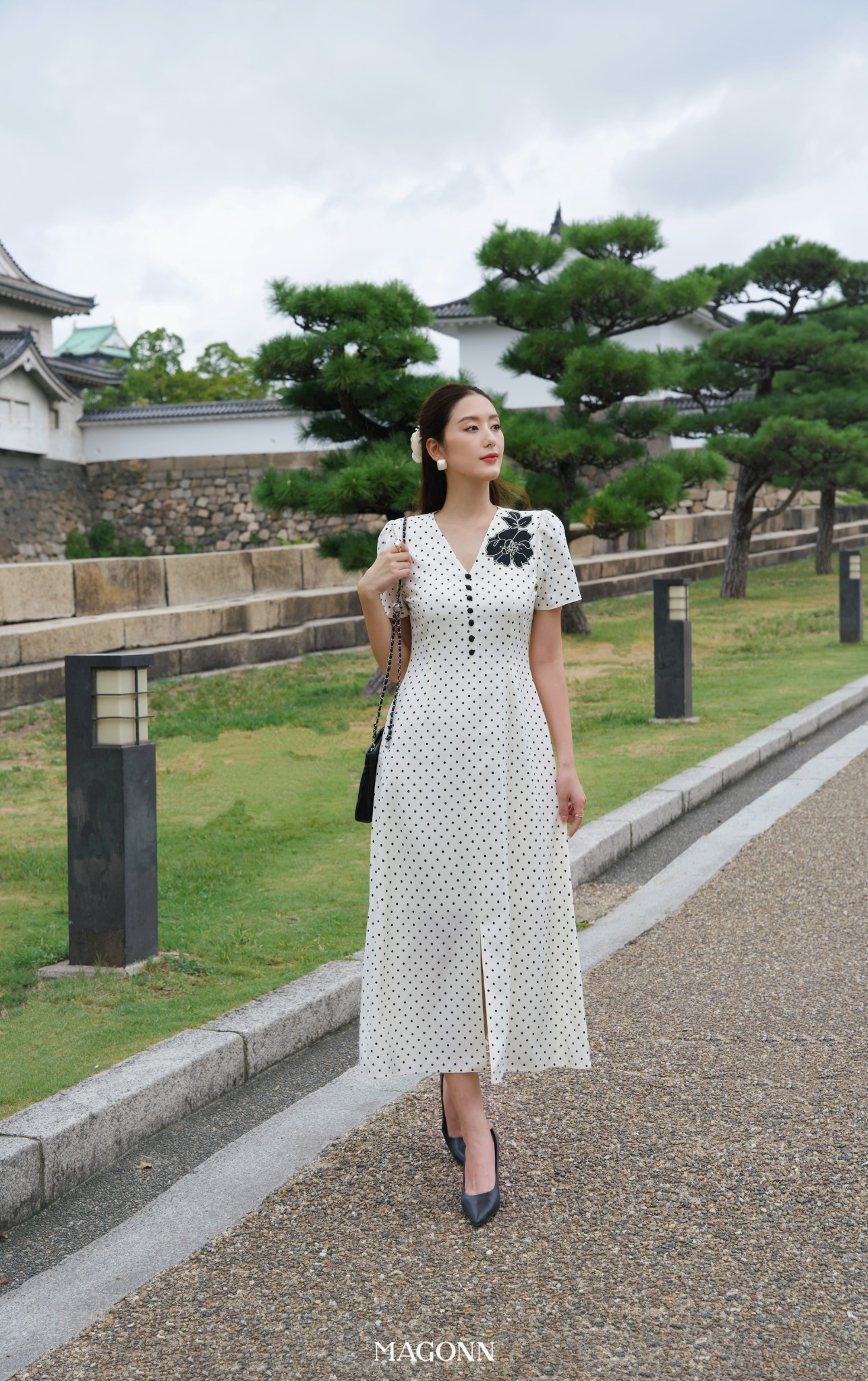 * Kiểu dáng: Váy dáng dài, chiết eo, cổ V, tay ngắn