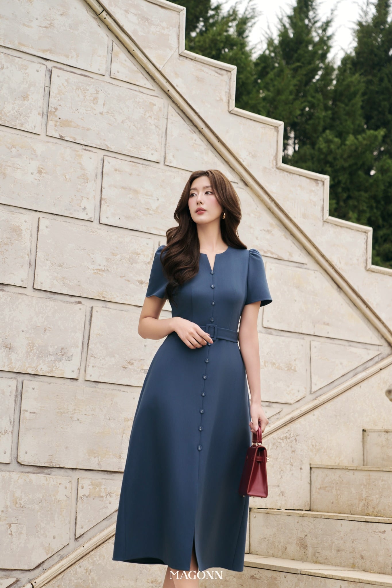 * Kiểu dáng: Đầm công sở, cổ tròn khoét V, chiết eo, kèm đai lưng