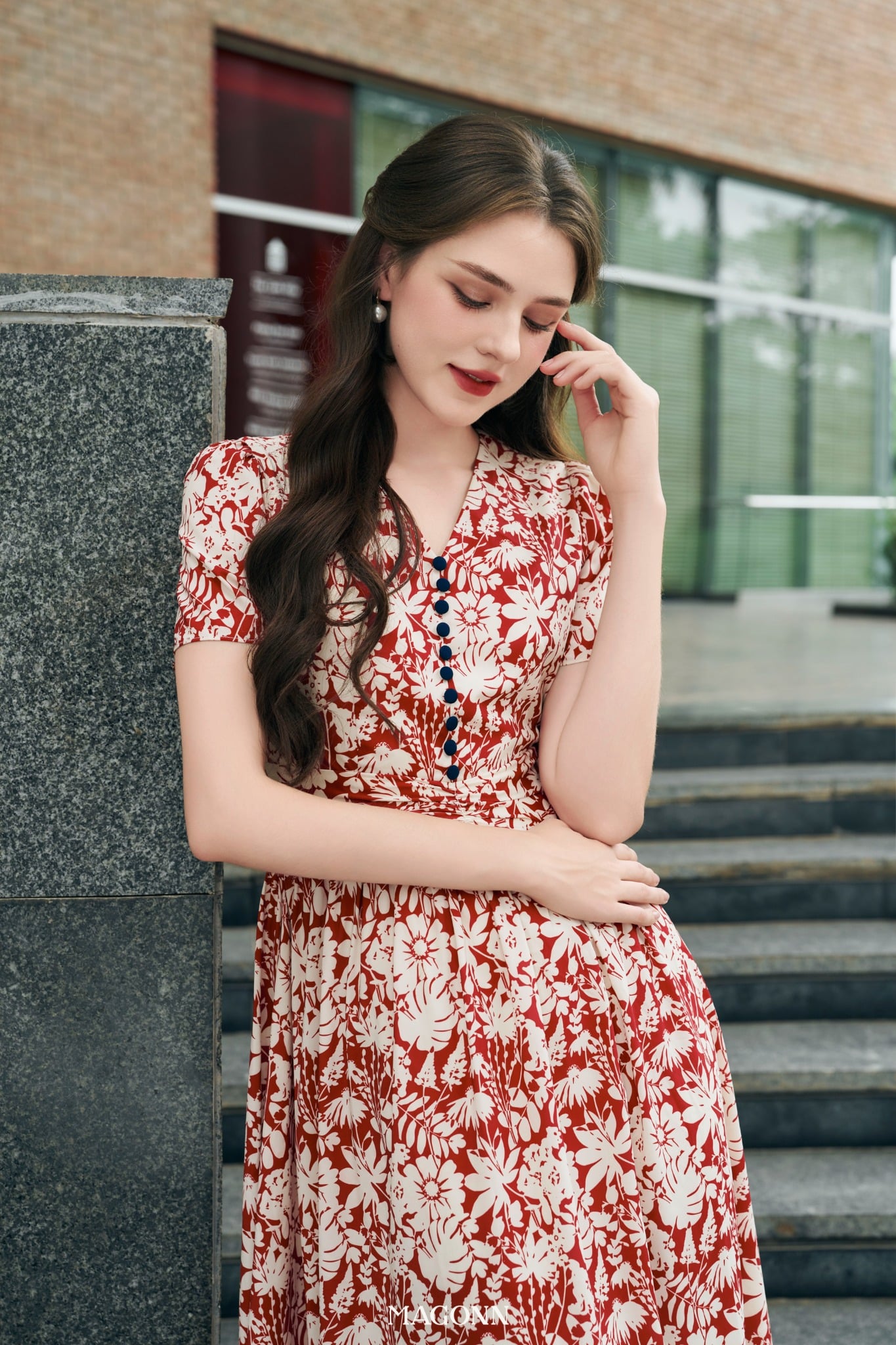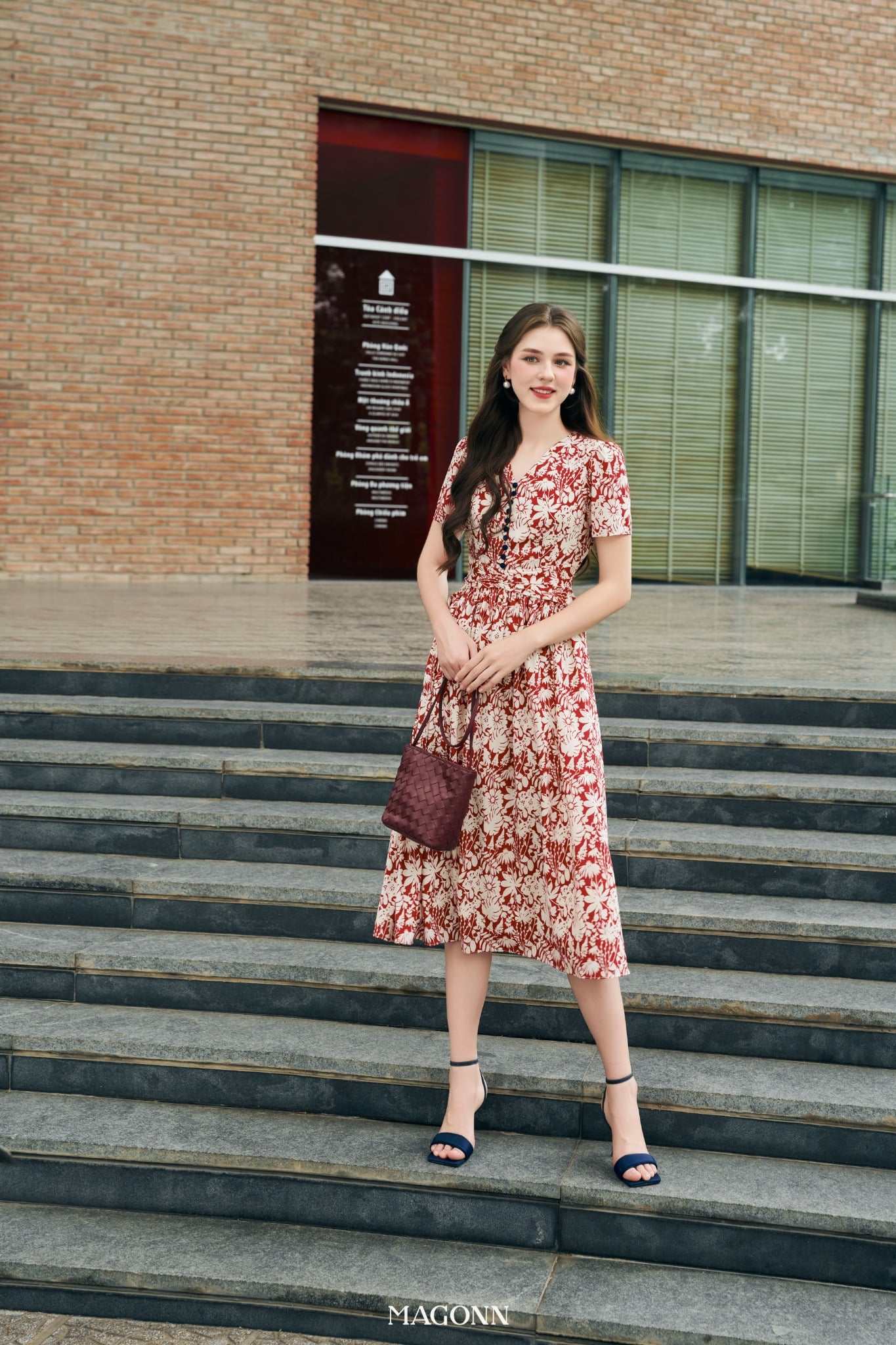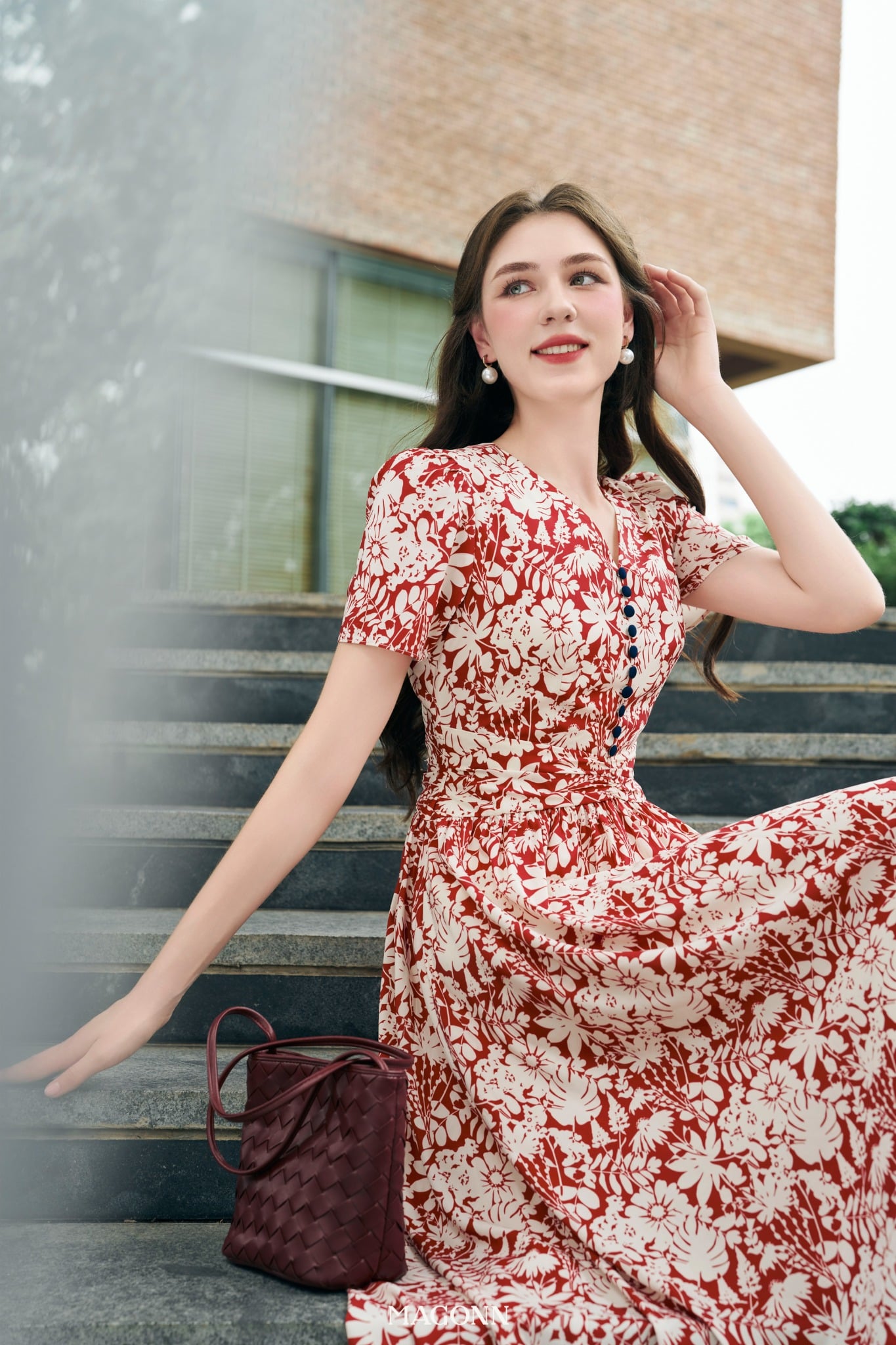 * Kiểu dáng: Váy dáng dài, chiết eo, tay ngắn, cổ V