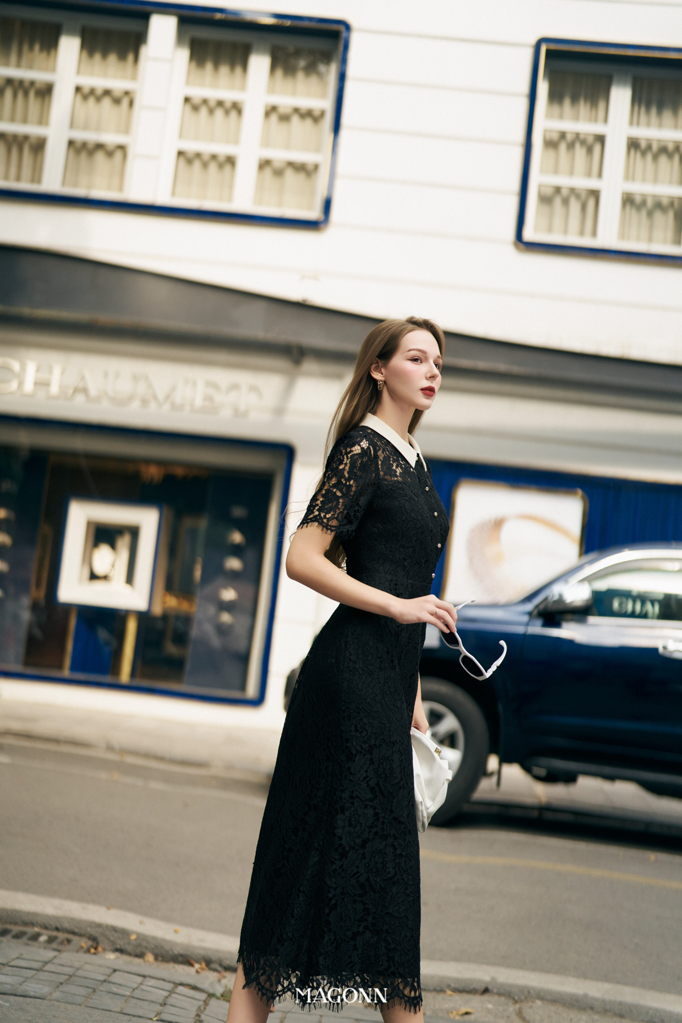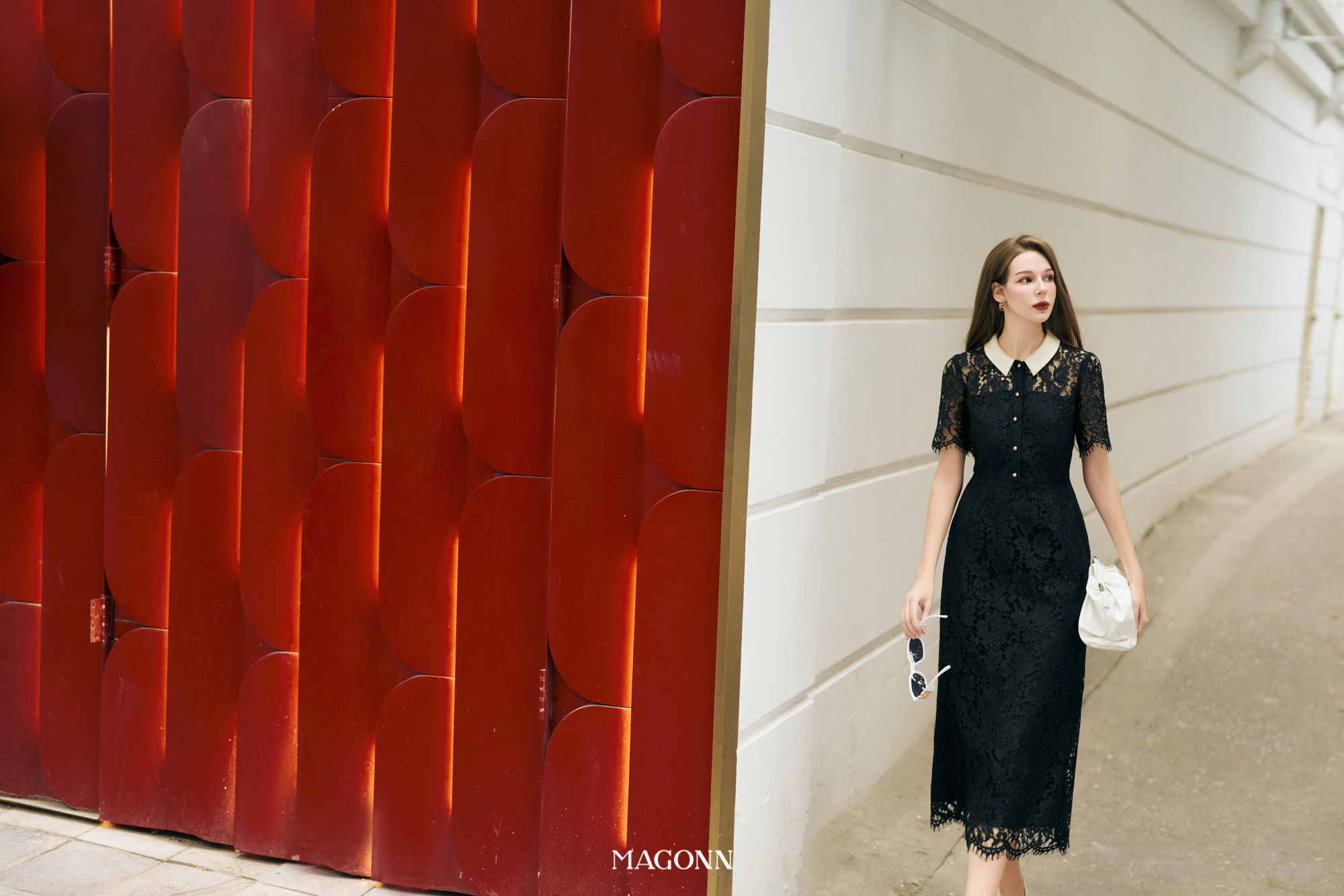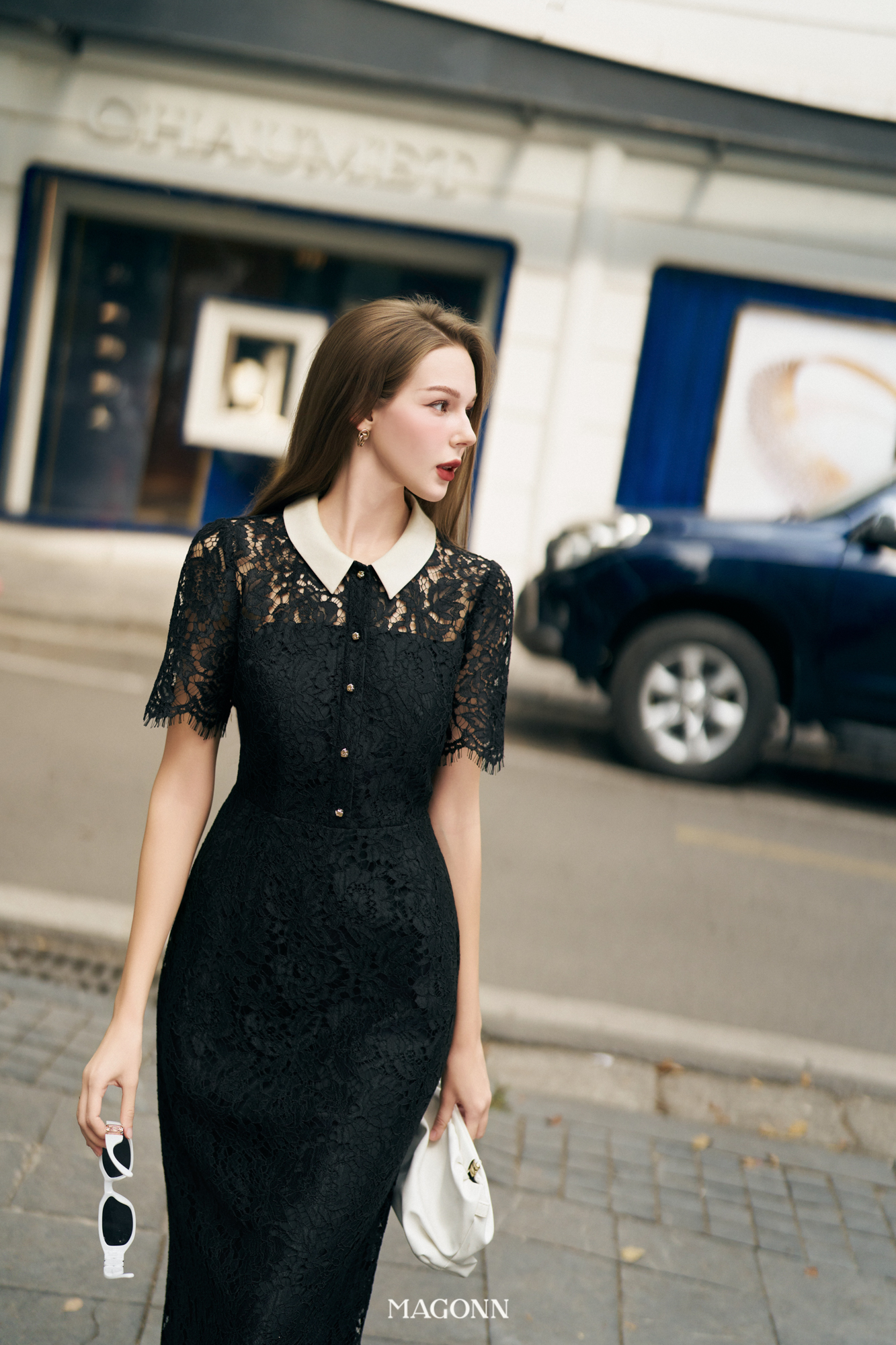 * Kiểu dáng: Váy chiết eo, tay ngắn, phối cổ