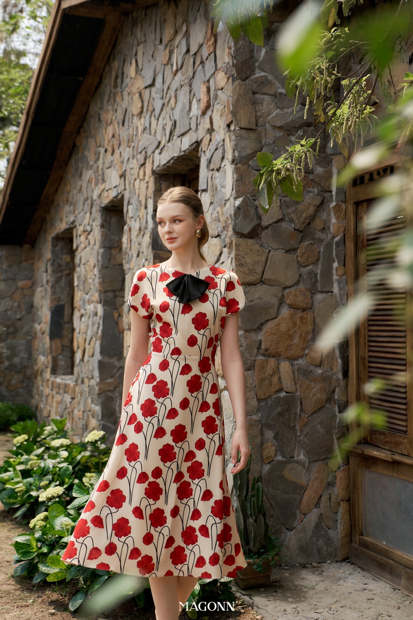 * Kiểu dáng: Váy chiết eo, cổ tròn, tay ngắn