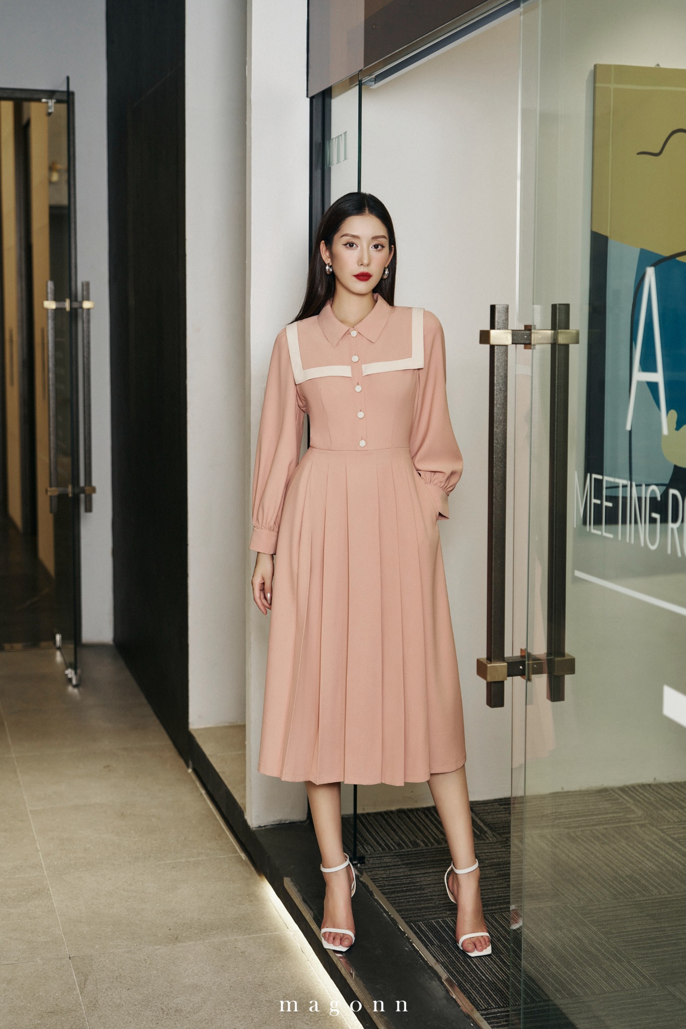 * Kiểu dáng: Váy liền, cổ Đức, cách điệu chờm ngang trước ngực, kéo khóa sau, tay dài |