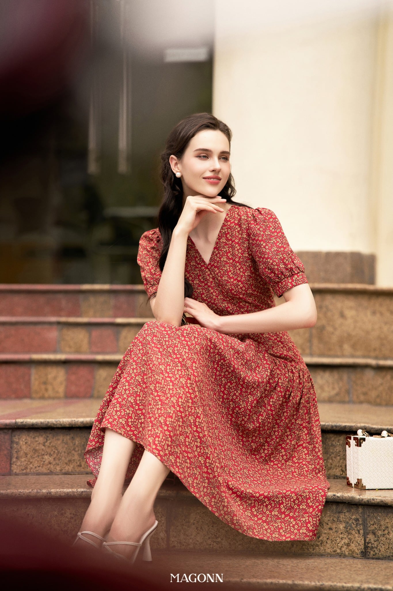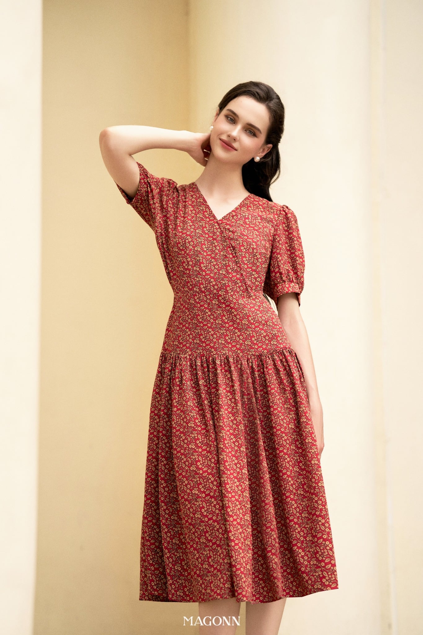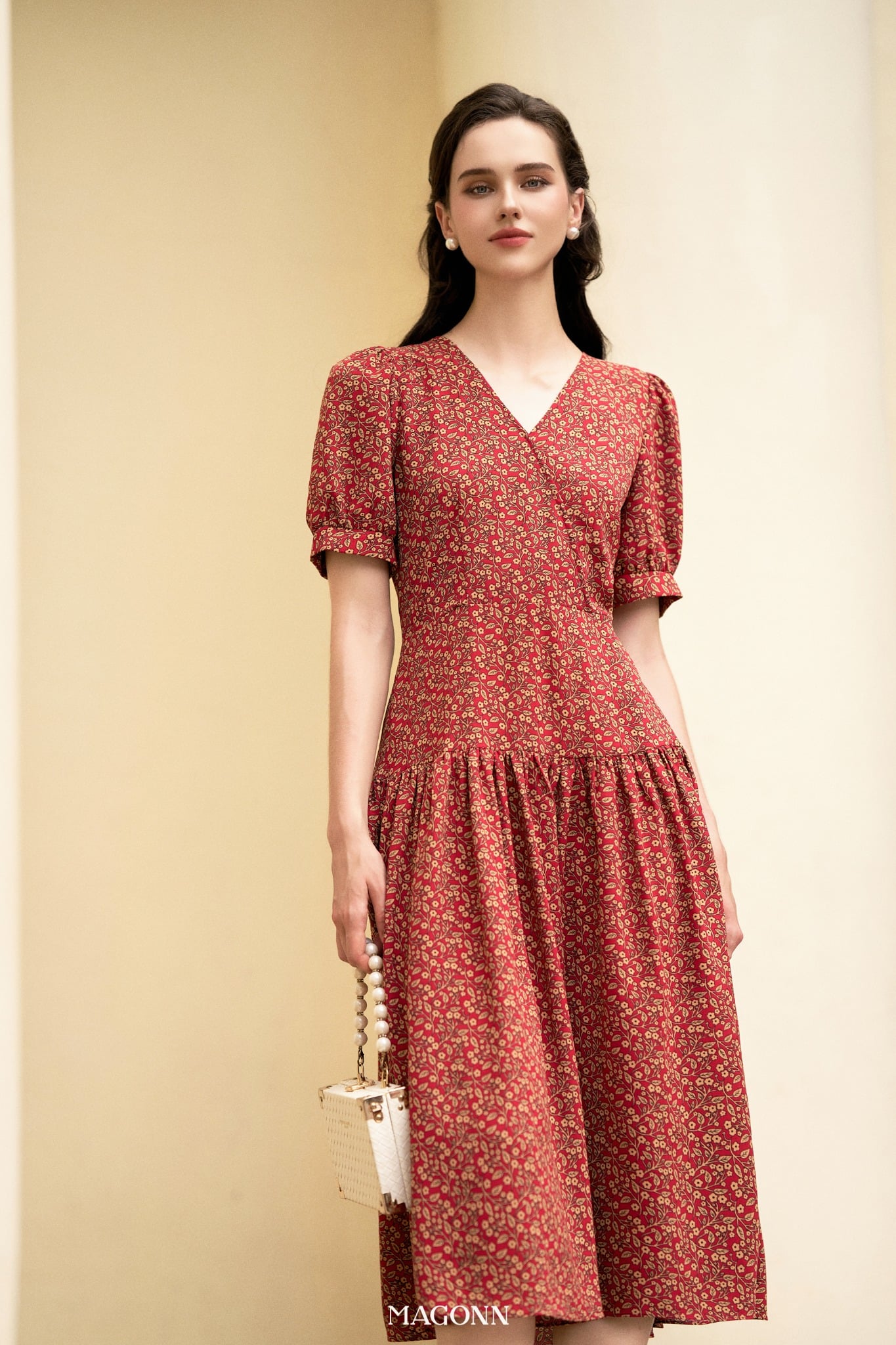 * Kiểu dáng: Váy chiết eo, cổ V, chân váy xòe