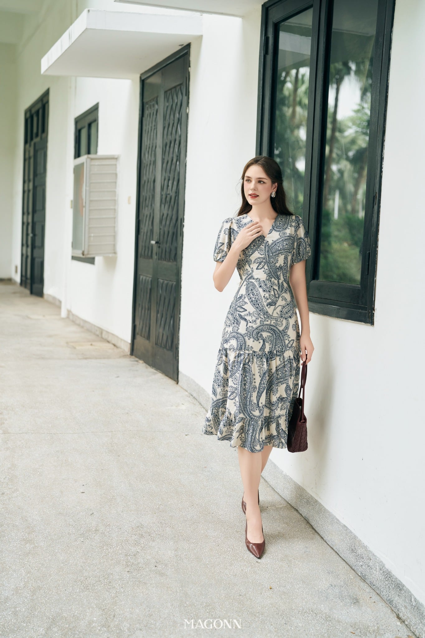 * Kiểu dáng: Váy dáng dài, cổ V, vai bồng nhẹ, chiết eo