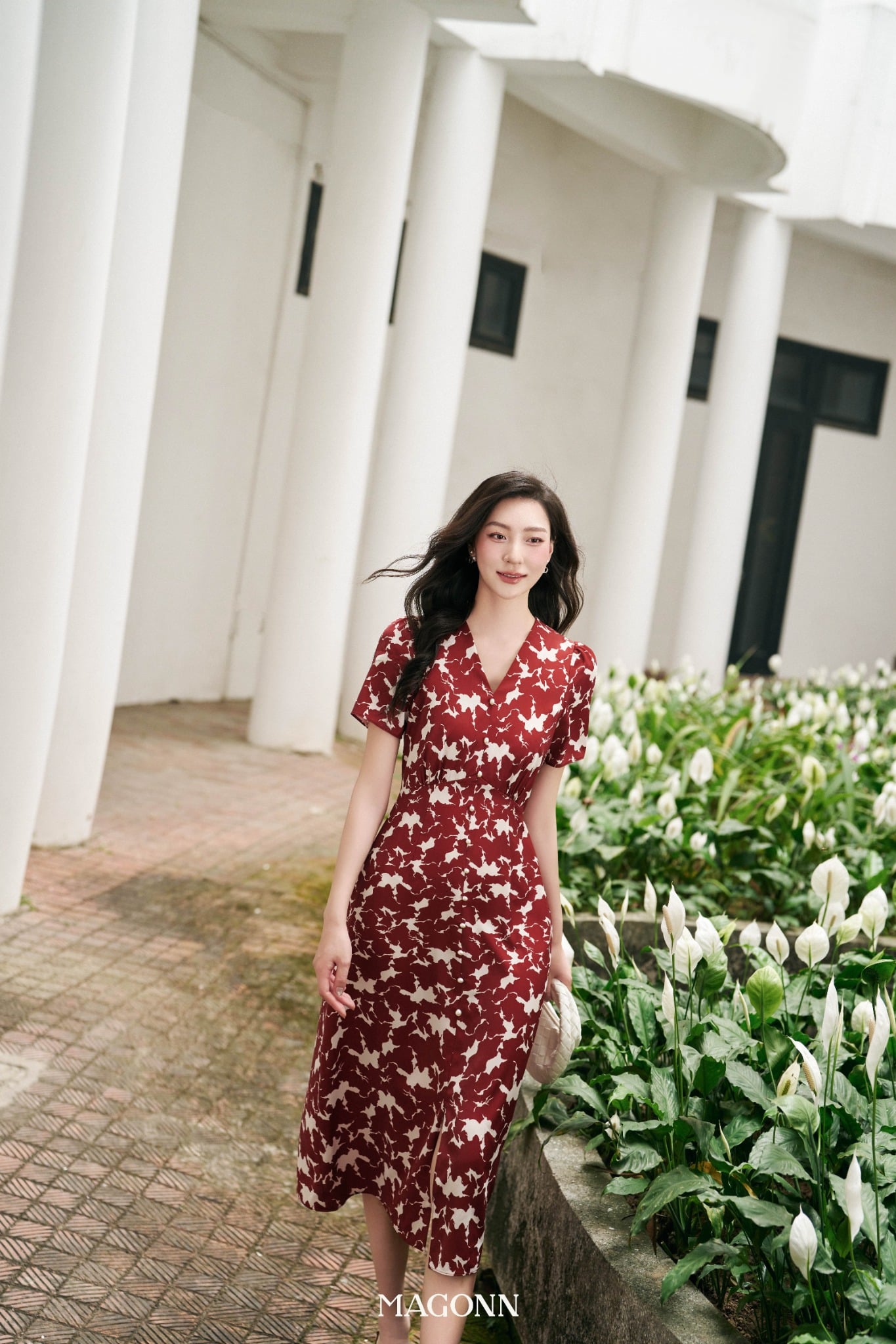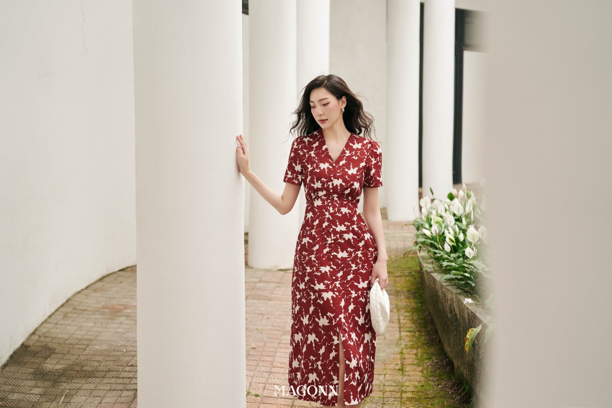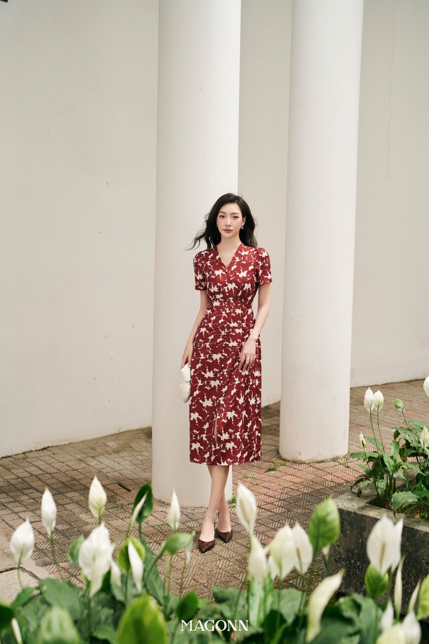 * Kiểu dáng: Váy dáng dài, chiết eo, cổ V