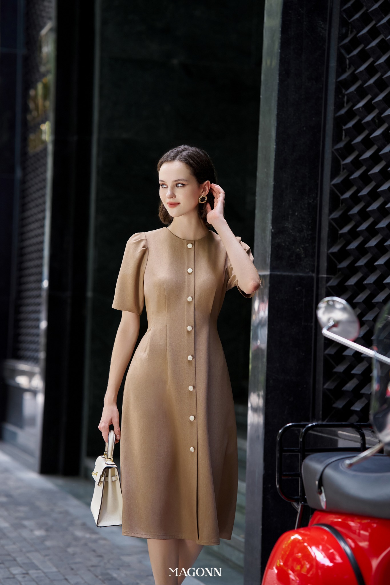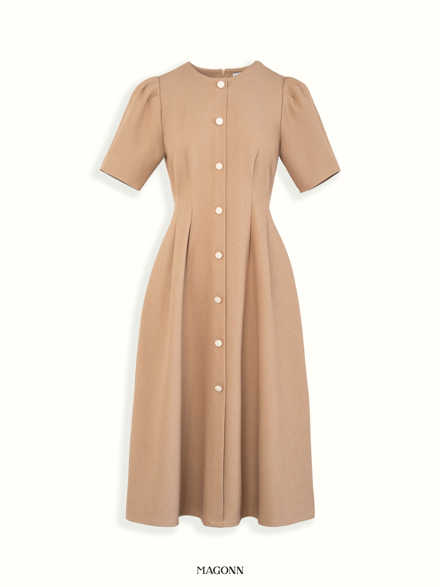 * Kiểu dáng: Váy cổ tròn, vai bồng nhẹ, chiết eo, phối cúc.