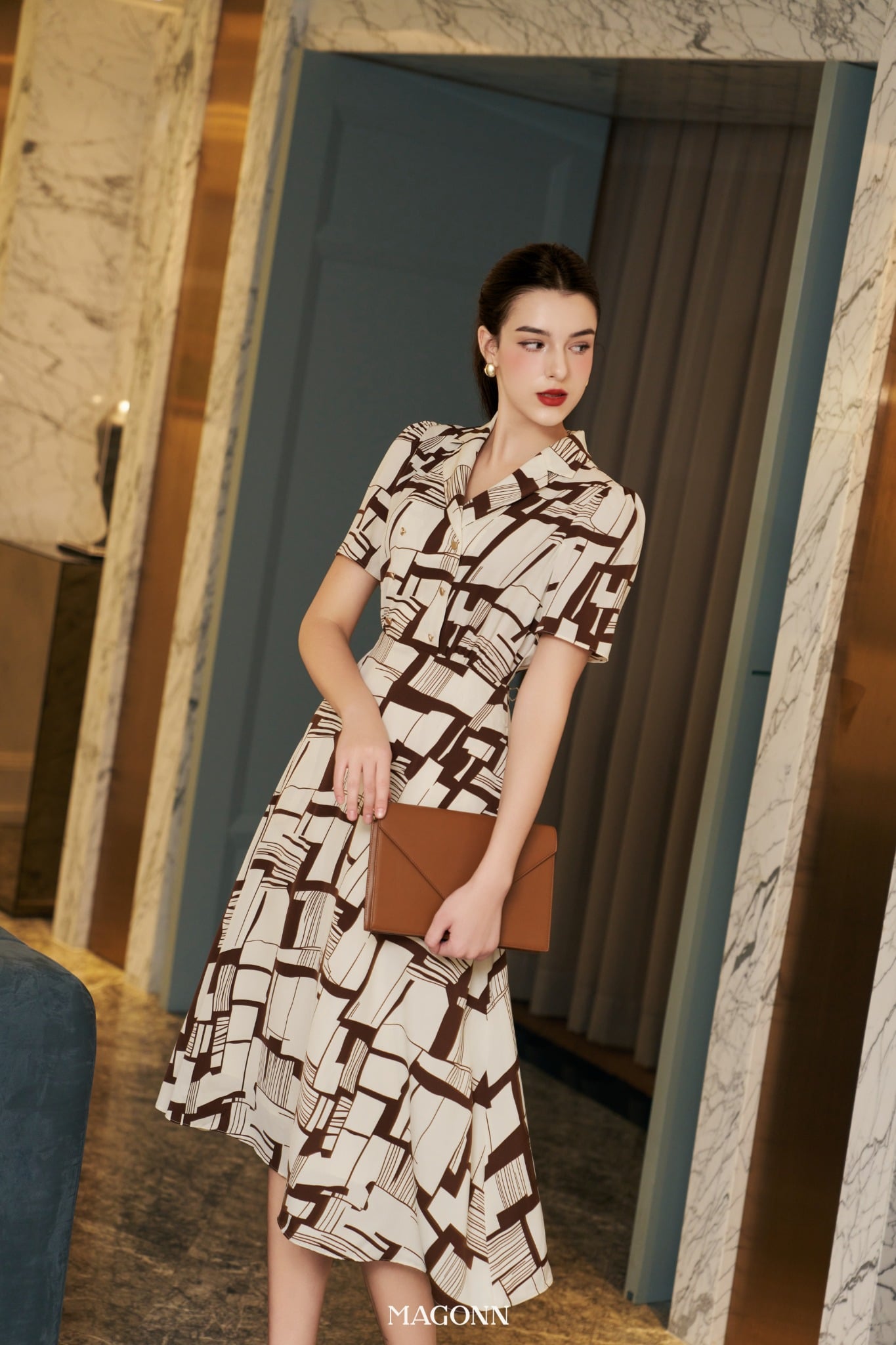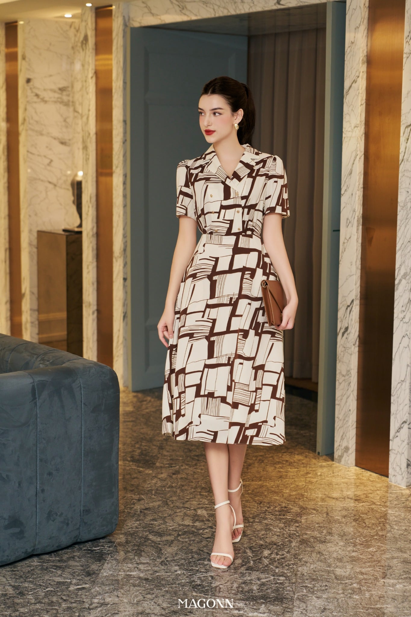 * Kiểu dáng: Váy chiết eo, cổ vest, tay ngắn, phối cúc 2 hàng