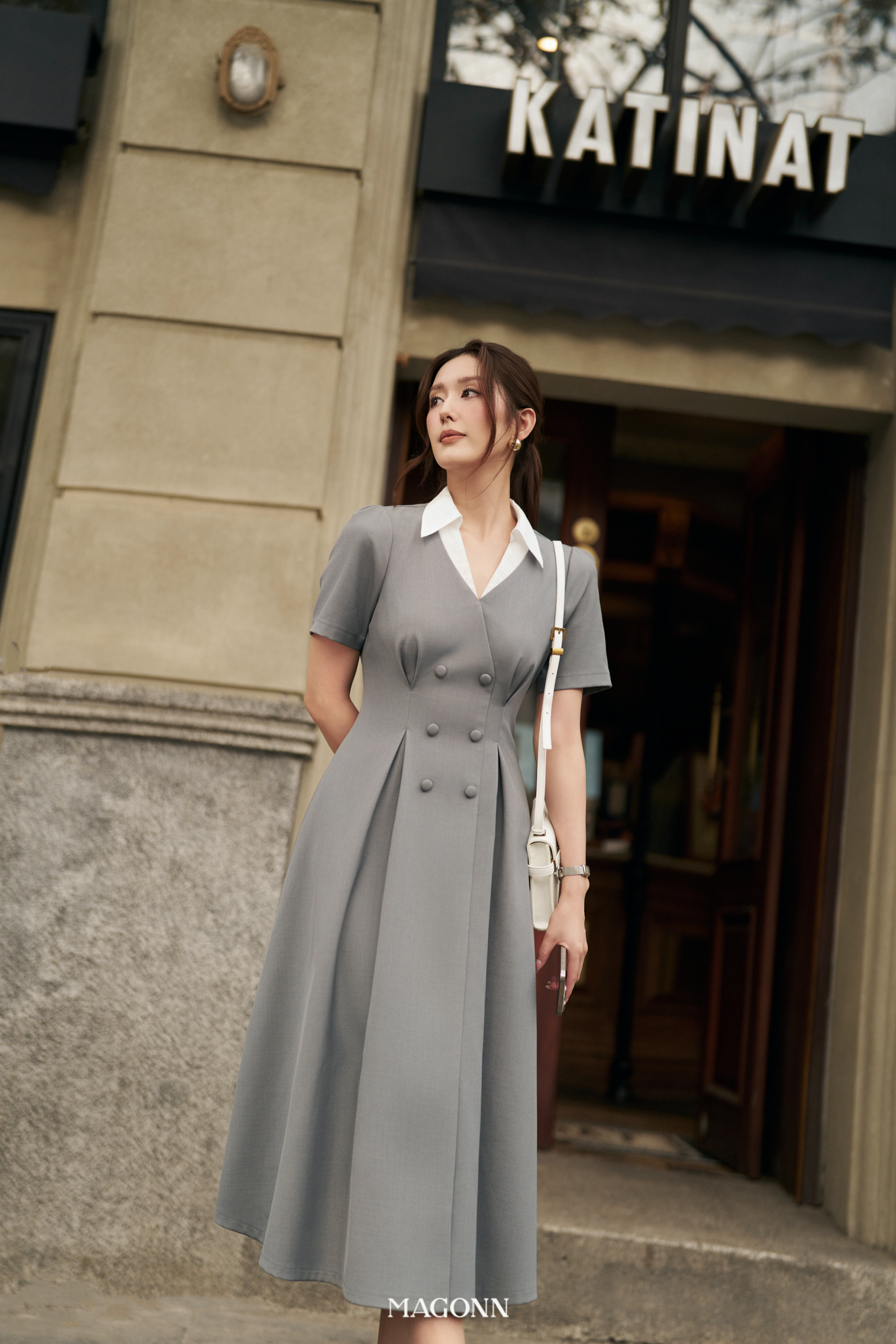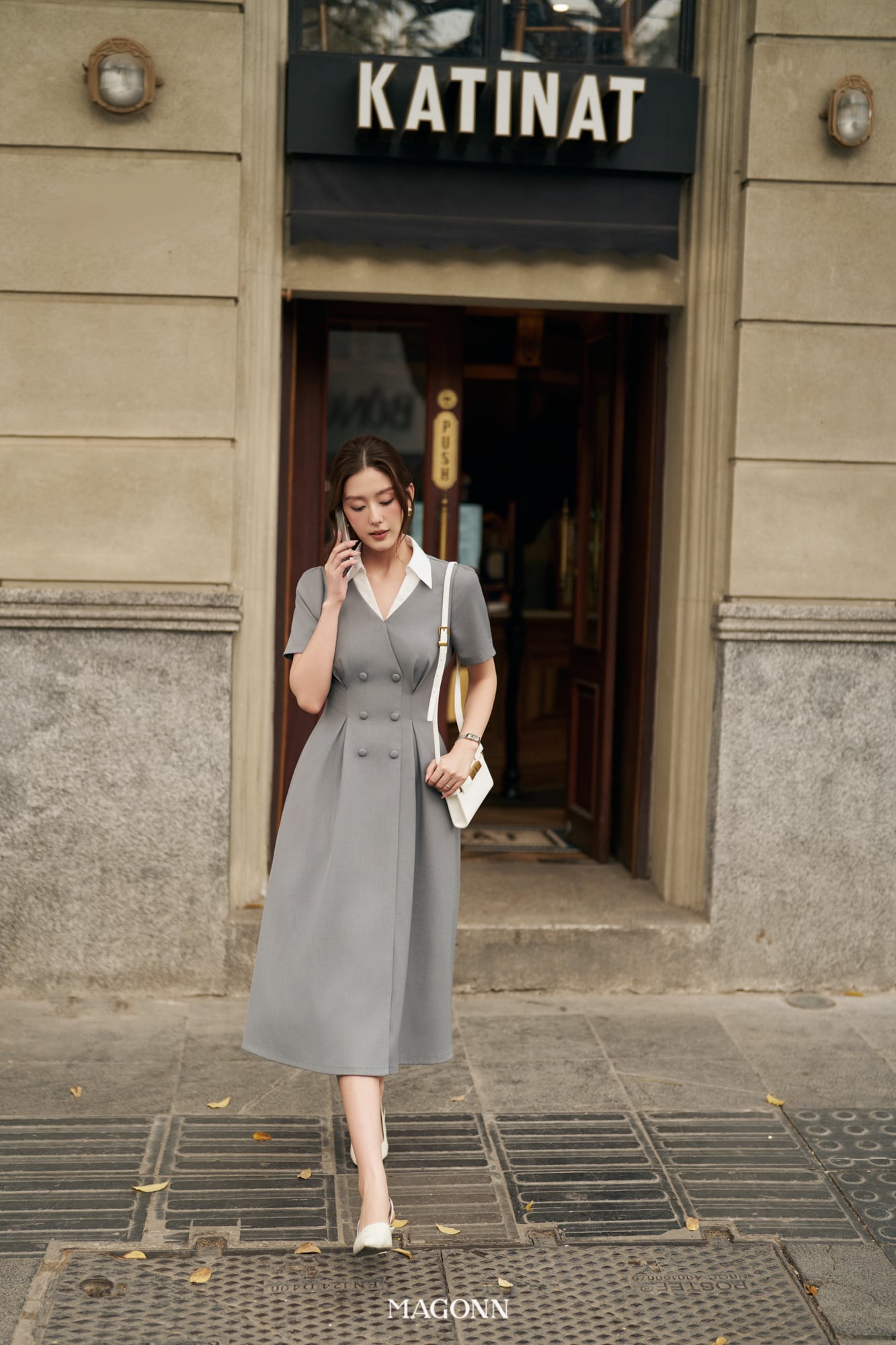 * Kiểu dáng: Váy chiết eo, cổ bẻ, tay ngắn