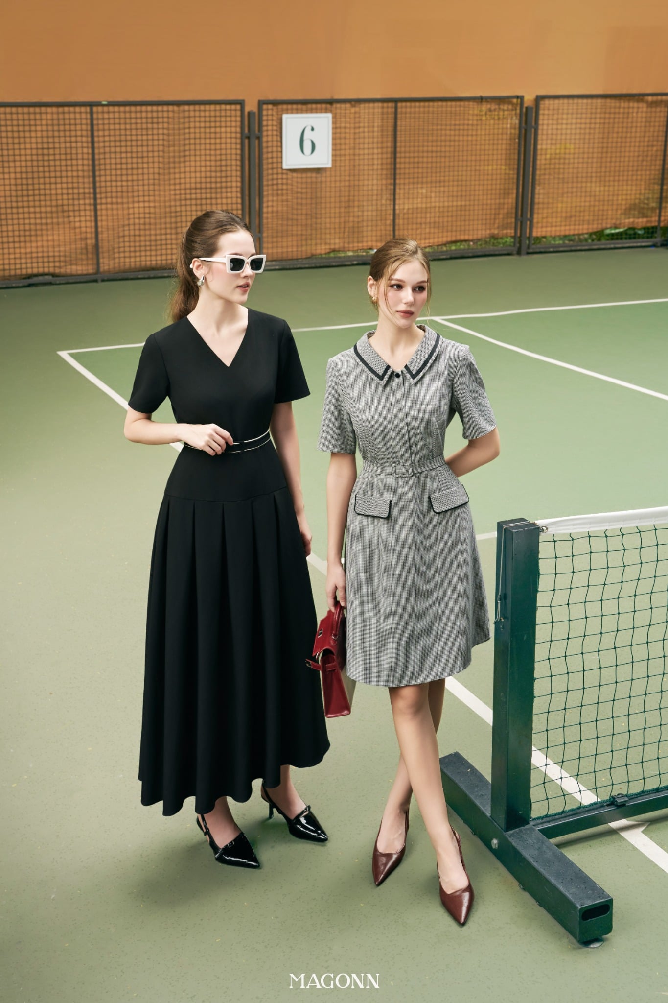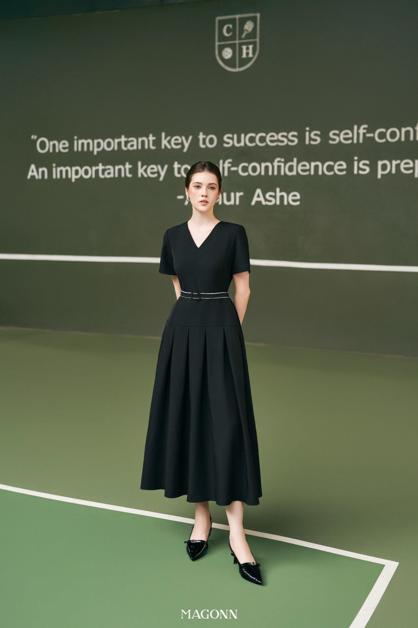 * Kiểu dáng: Váy chiết eo, cổ V, tay ngắn, kèm đai
