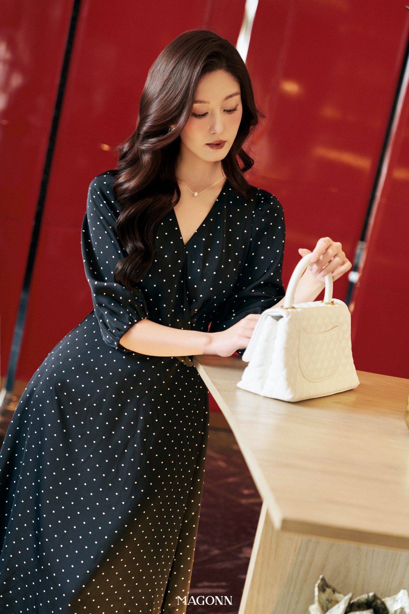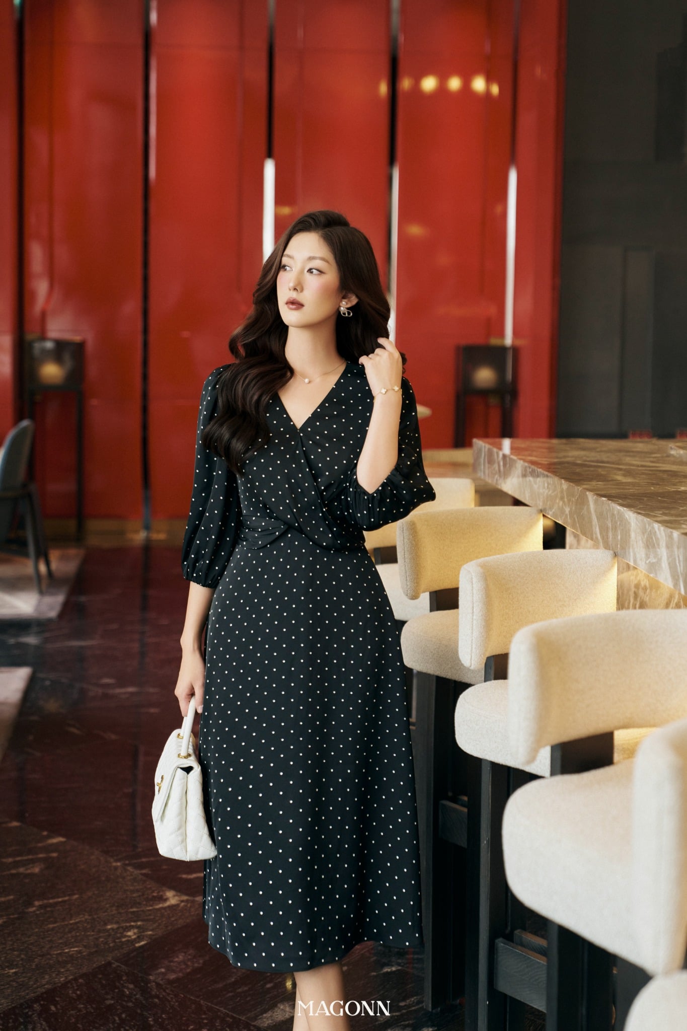* Kiểu dáng: Váy dáng dài, chiết eo, cổ V, tay lửng bồng nhẹ