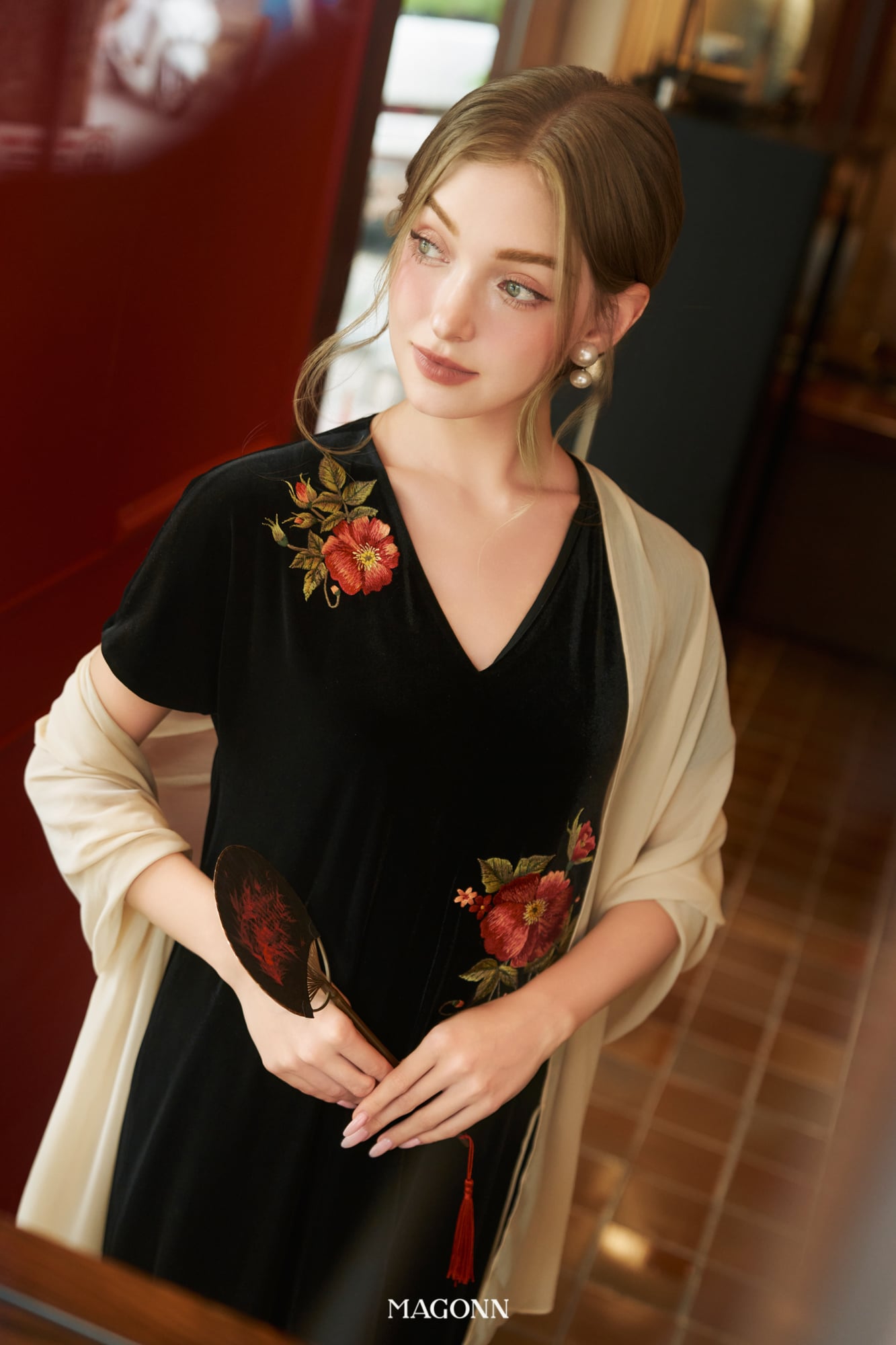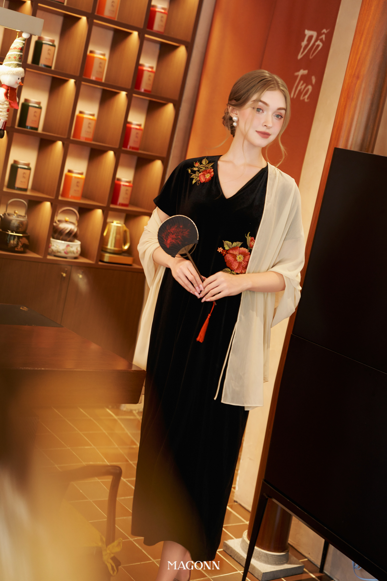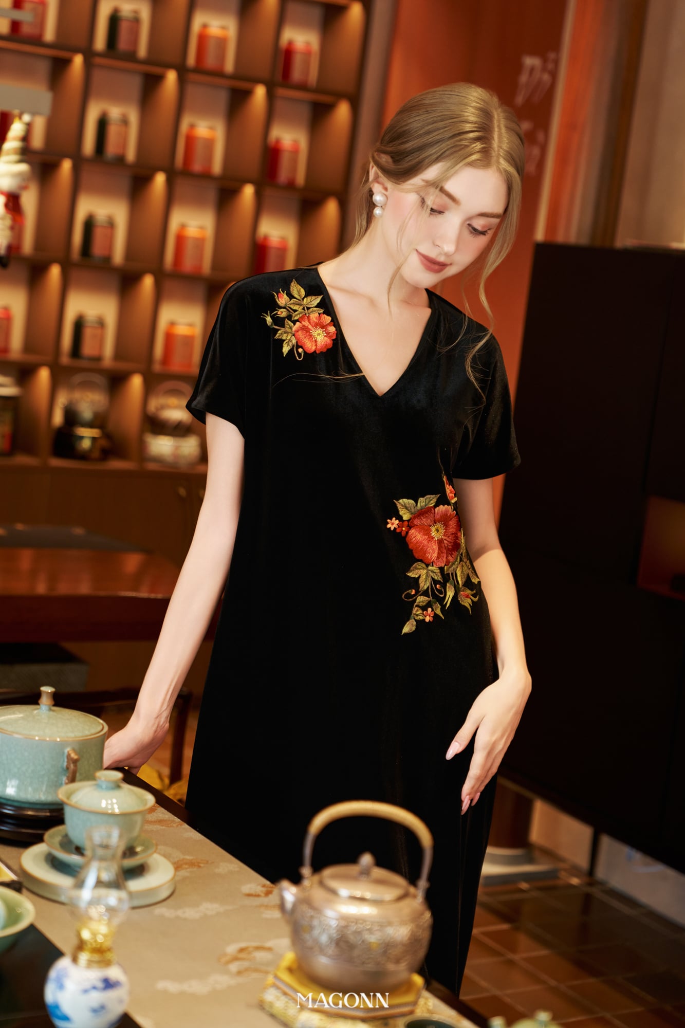 * Kiểu dáng: Váy dáng suông, cổ V, tay ngắn, thêu hoa