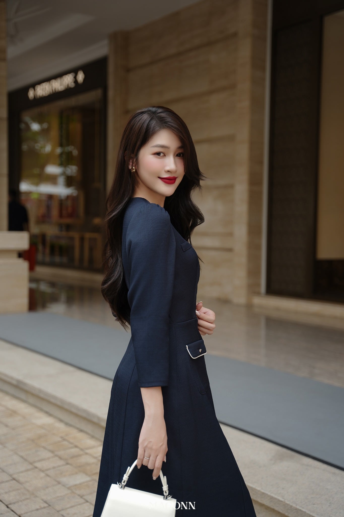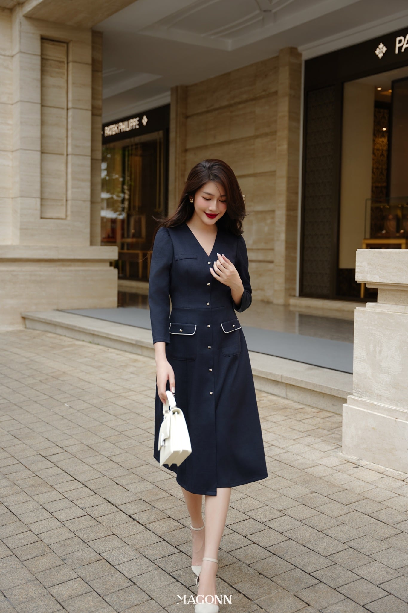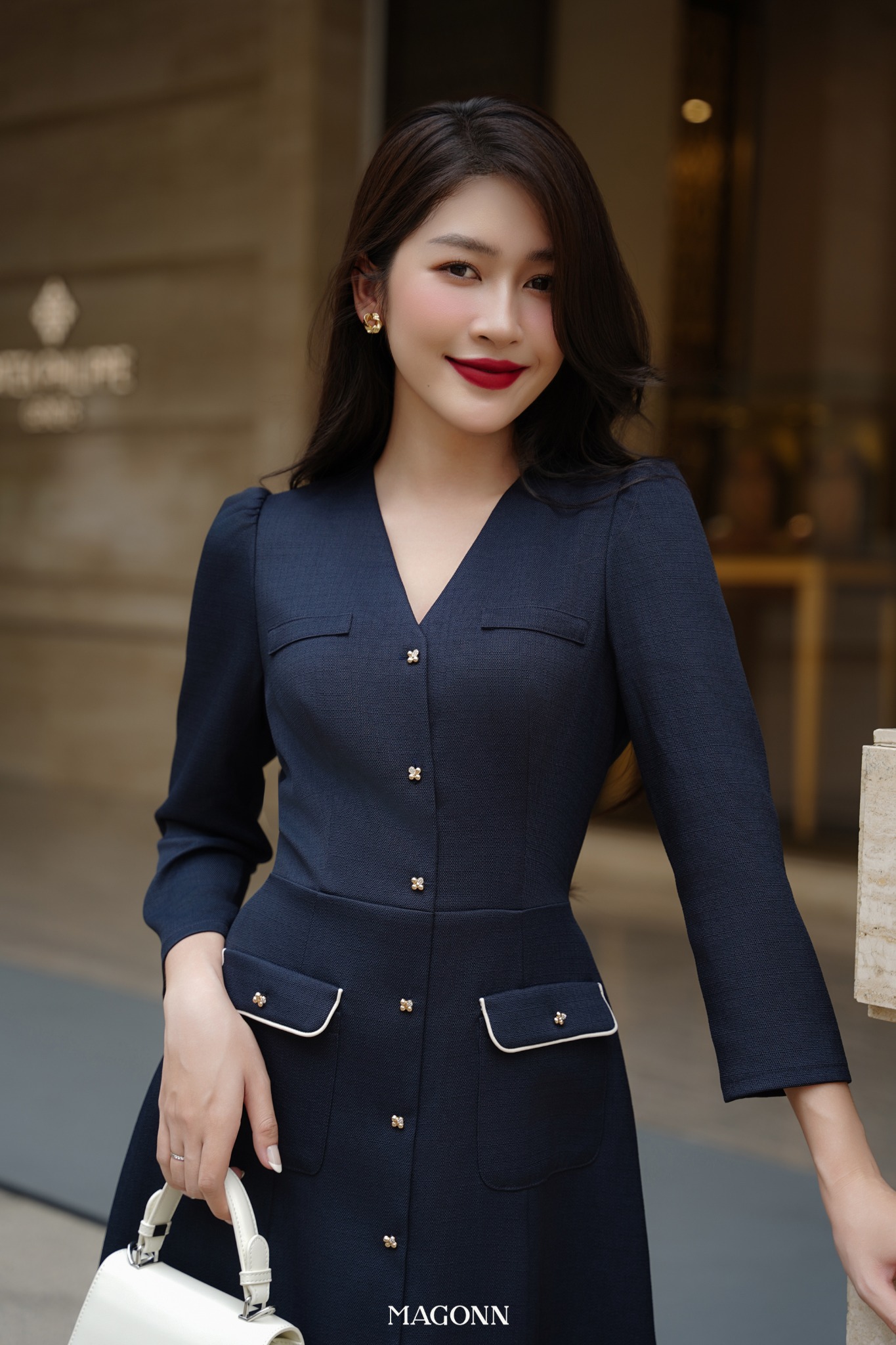* Kiểu dáng: Váy liền, chiết eo, cổ V, tay dài
