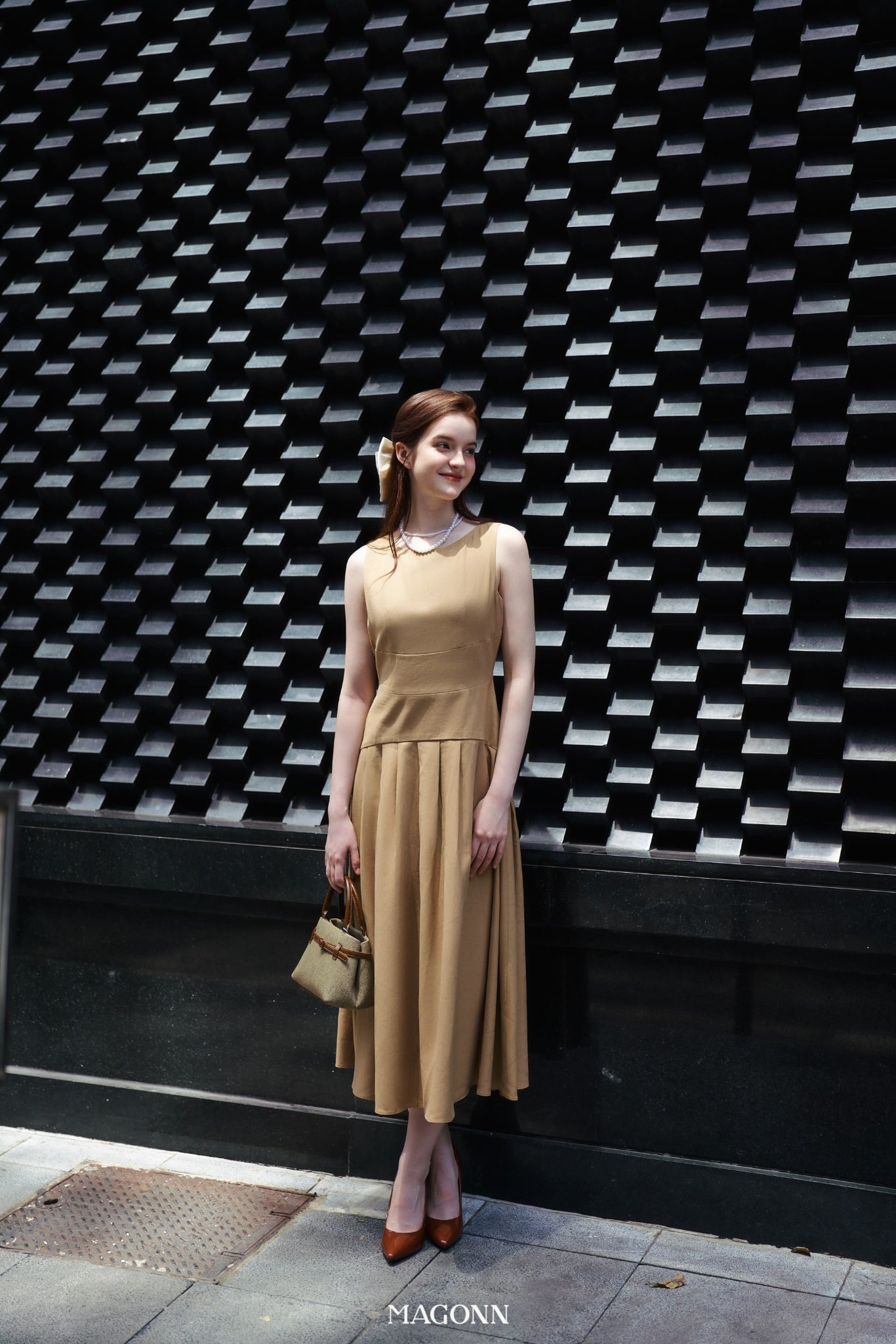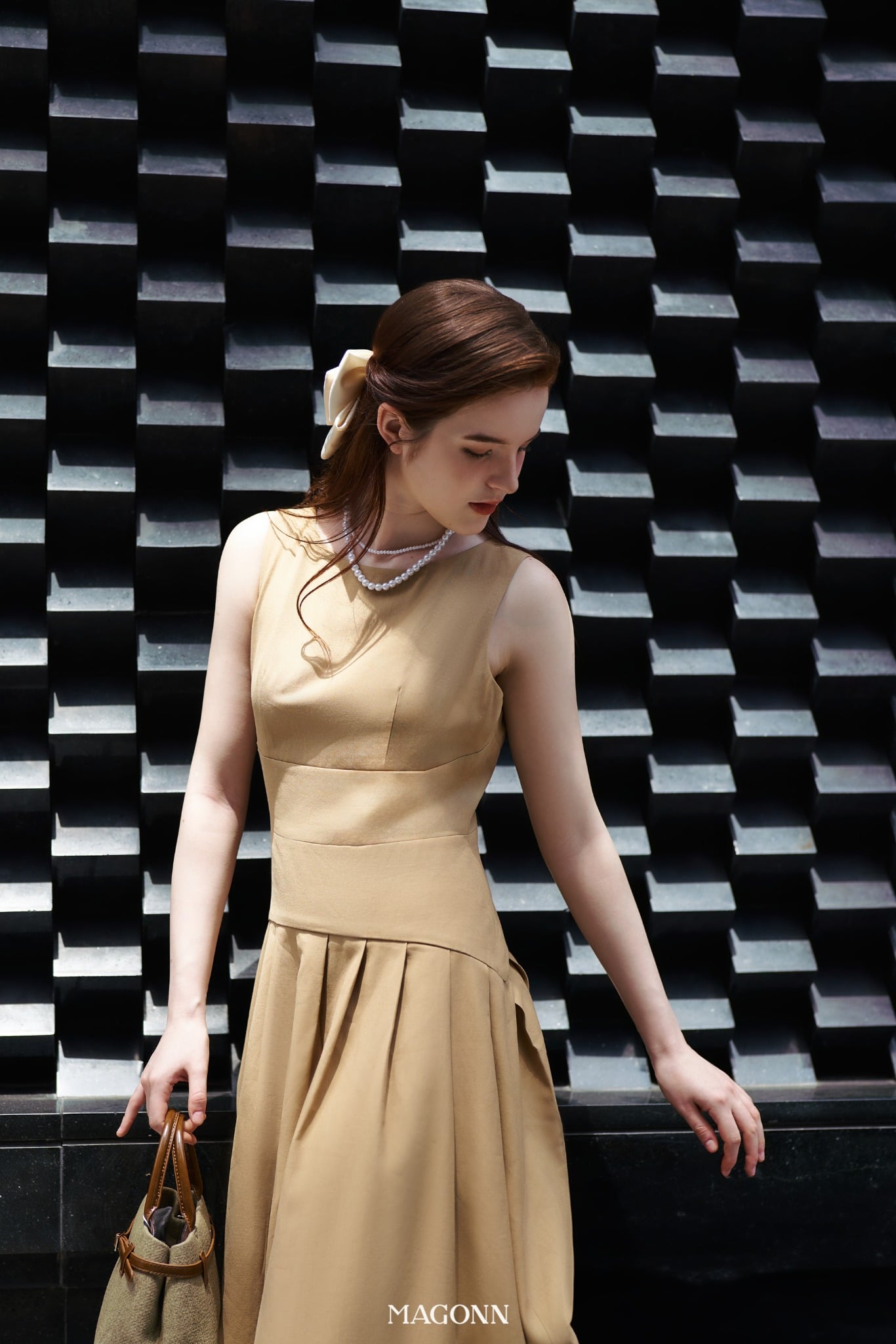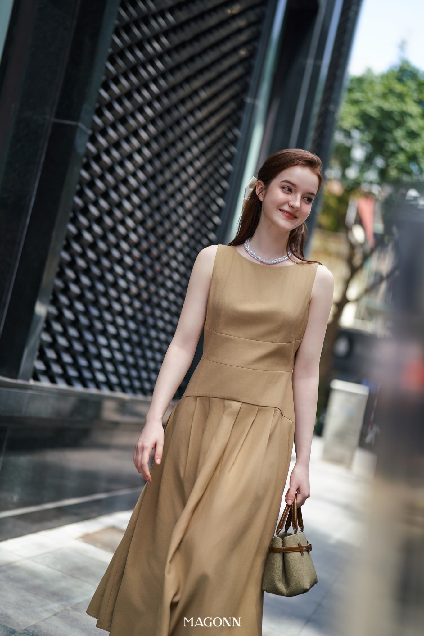 * Kiểu dáng: Váy sát nách, chiết eo, cổ tròn, hạ eo