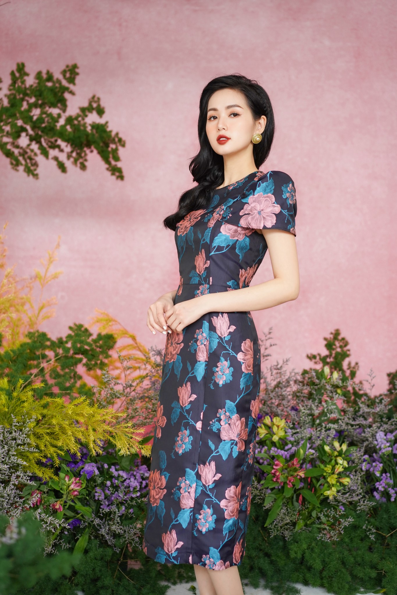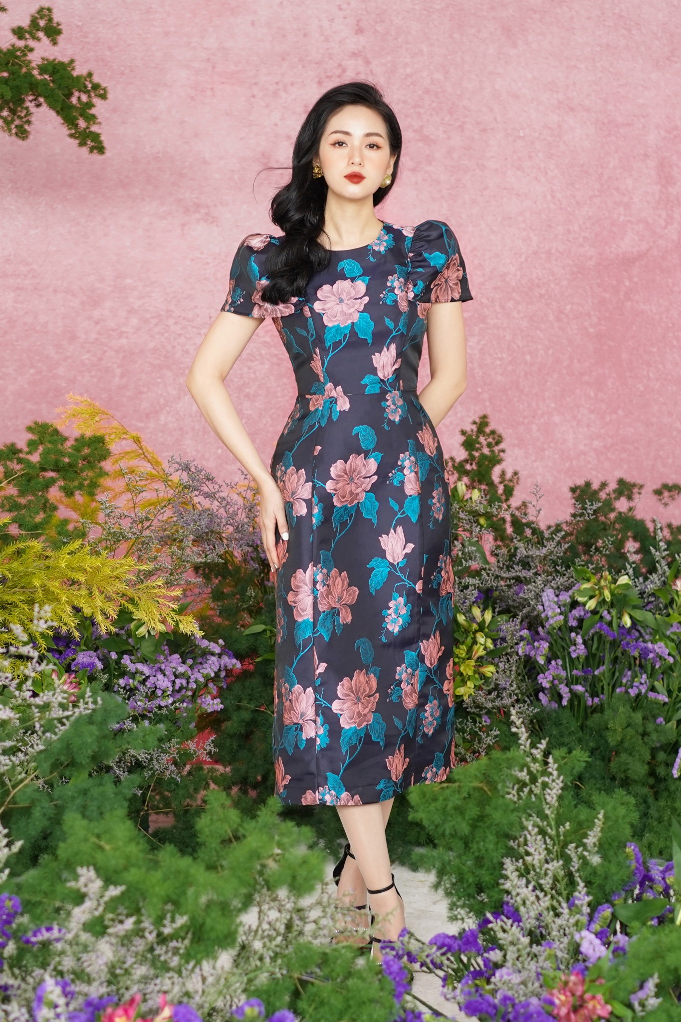* Kiểu dáng: Đầm midi dáng dài, chiết eo, cổ tròn, tay ngắn, chân đầm suông, xẻ tà sau, khóa kéo lưng