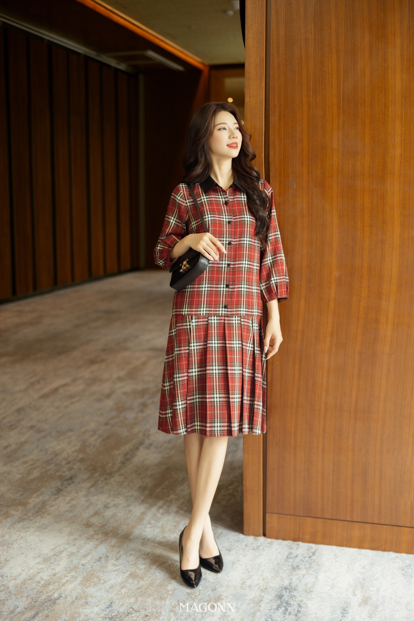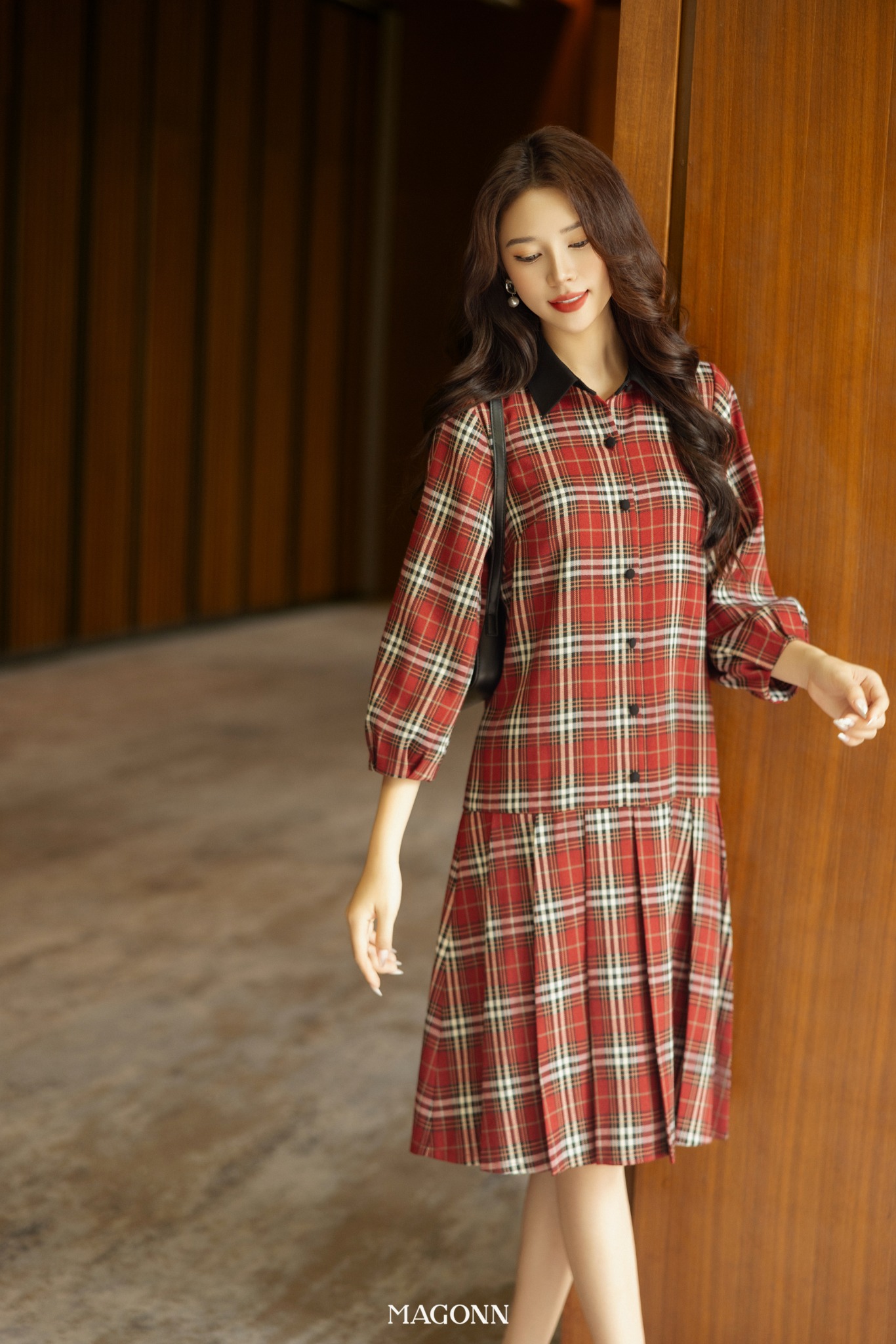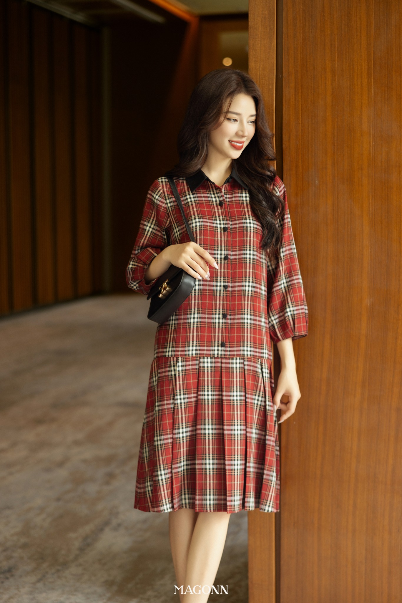 * Kiểu dáng: Váy dáng suông, cổ đức, phối cúc, tay lửng bồng.