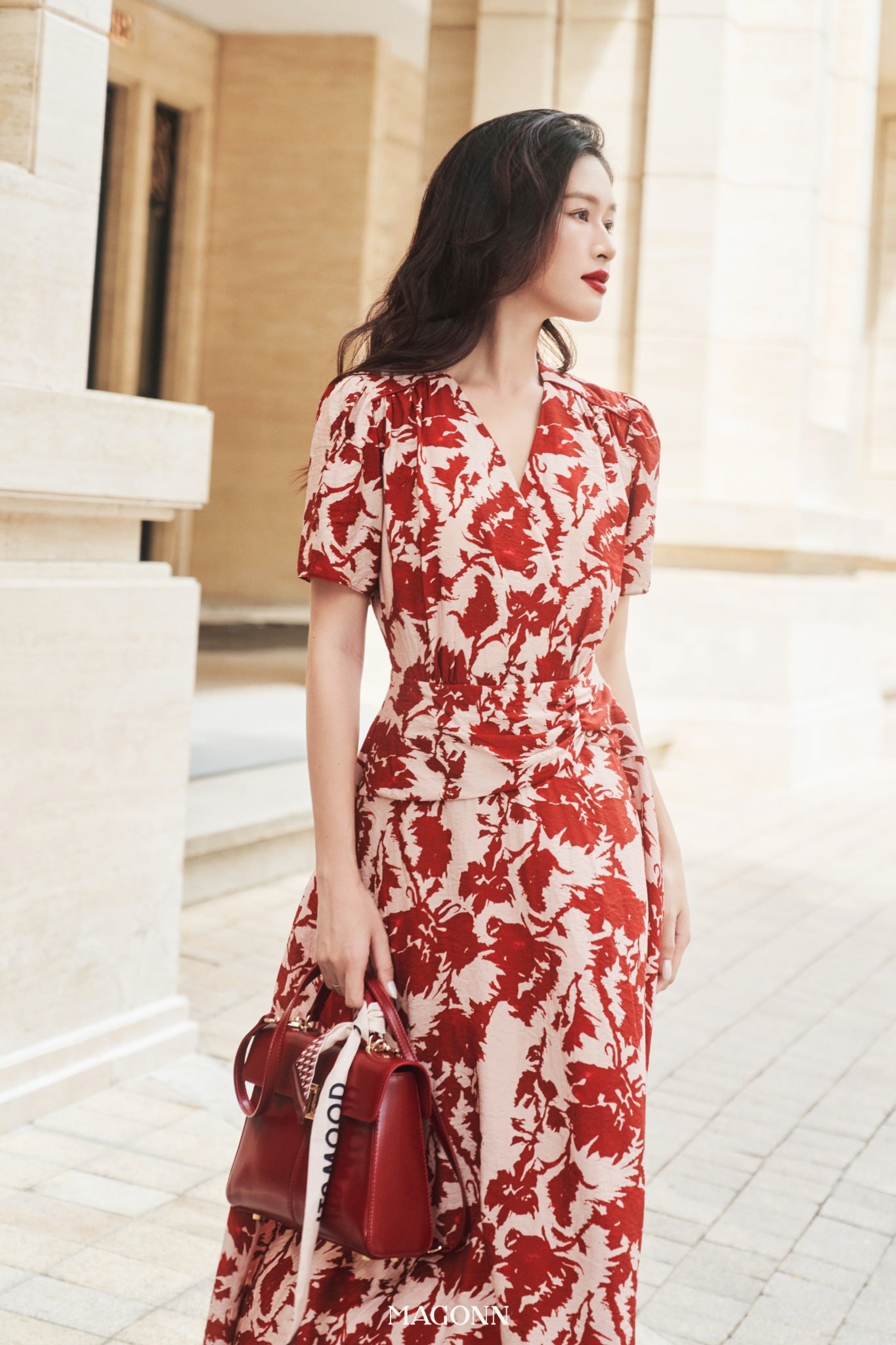 * Kiểu dáng: Váy dáng dài, chiết eo, cổ V, tay ngắn, nhún eo