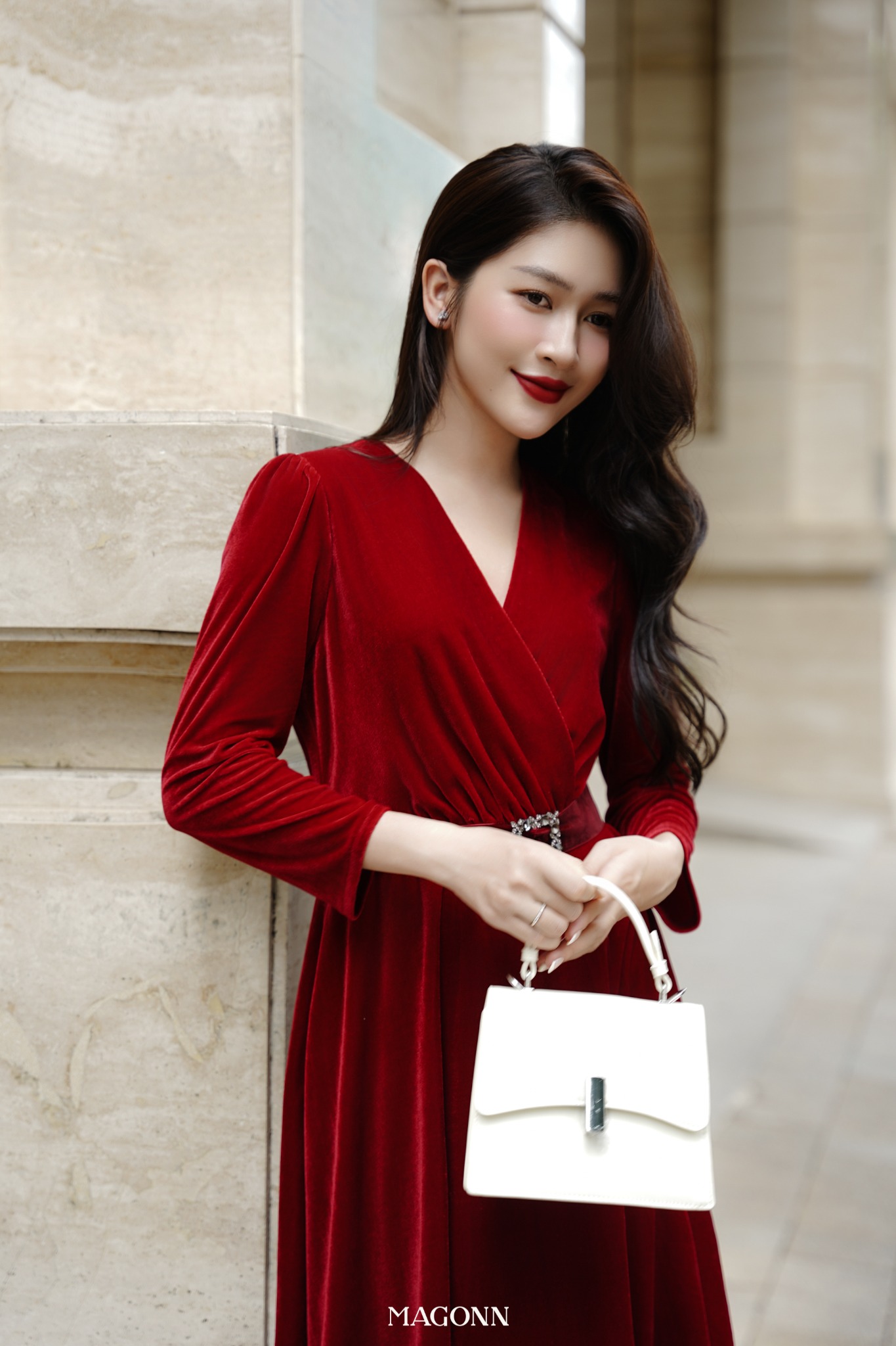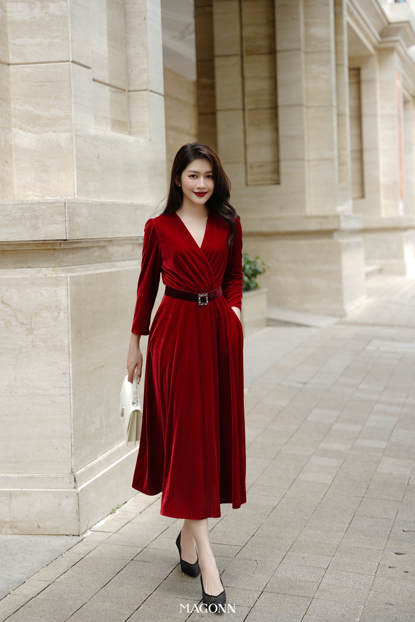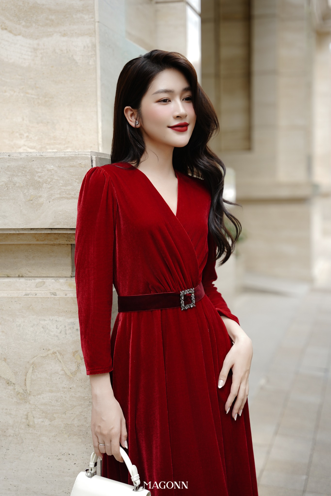 * Kiểu dáng: Váy liền, cổ V, tay dài, chiết eo