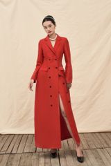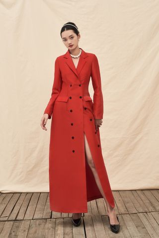 Đầm dài chiết eo, cổ vest, dài tay, nút cài trước