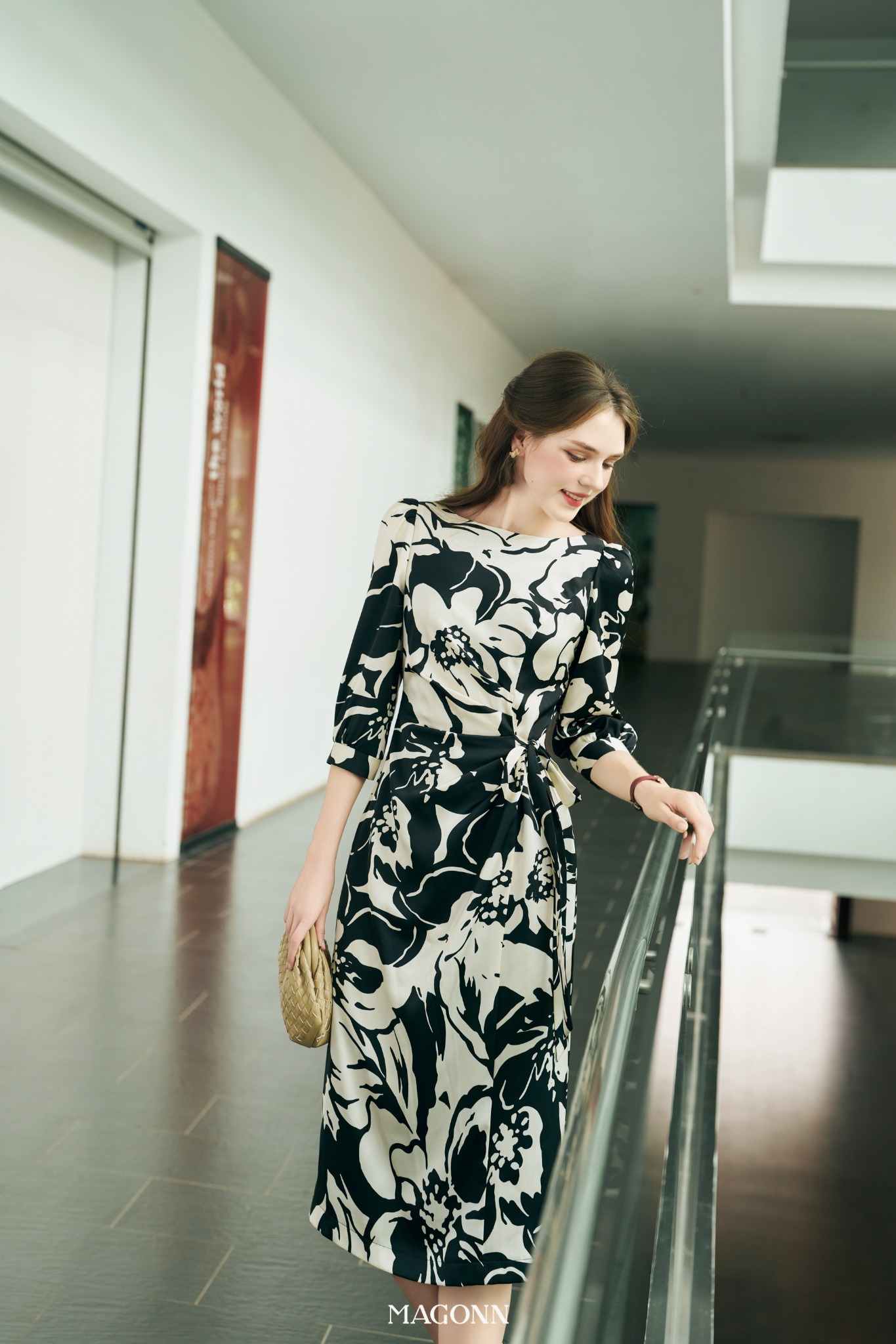 * Kiểu dáng: Váy dáng dài, chiết eo, tay dài, cổ tròn