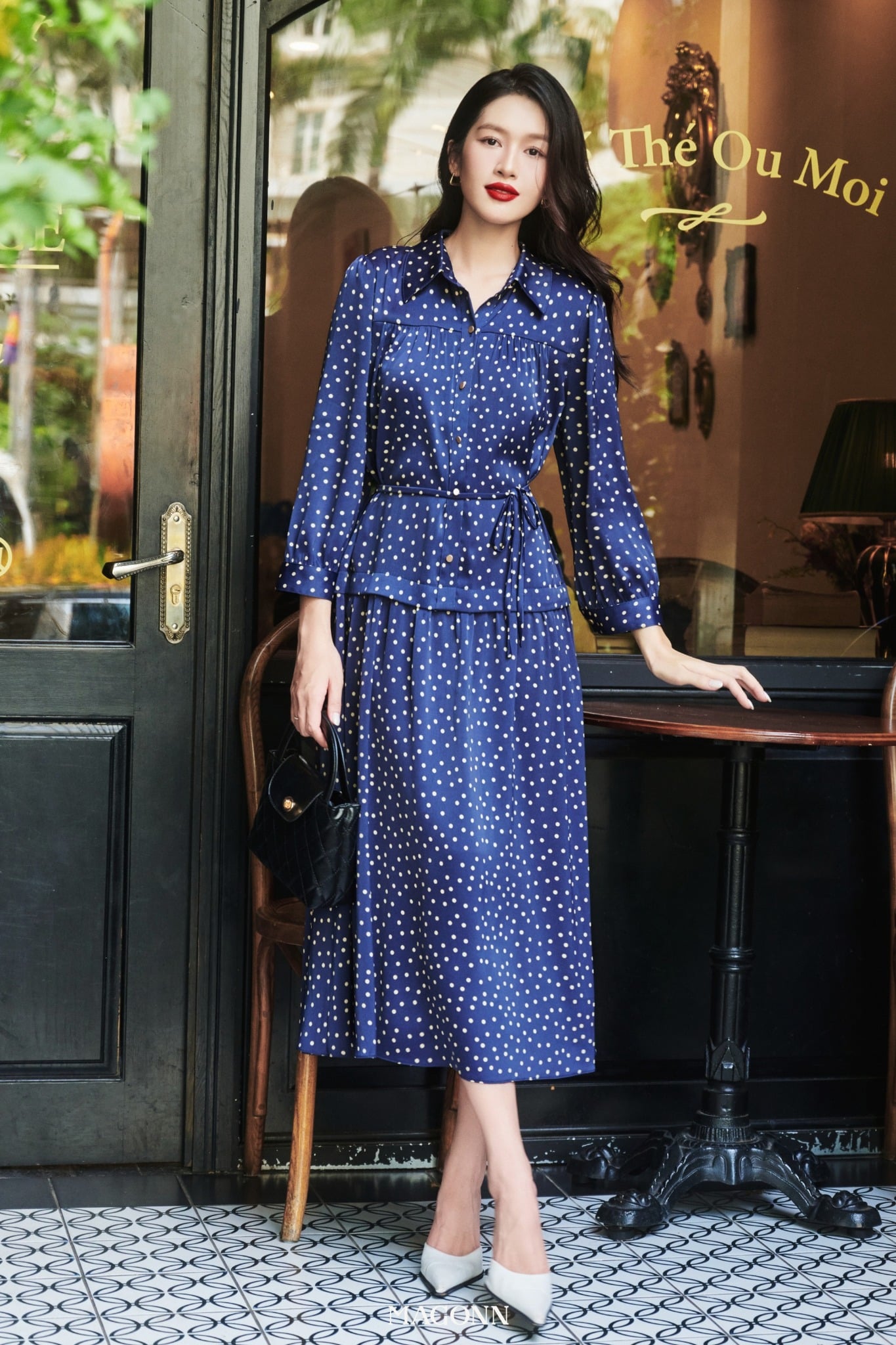 * Kiểu dáng: Váy liền, dáng suông, cổ sơ mi, tay dài, đai rời