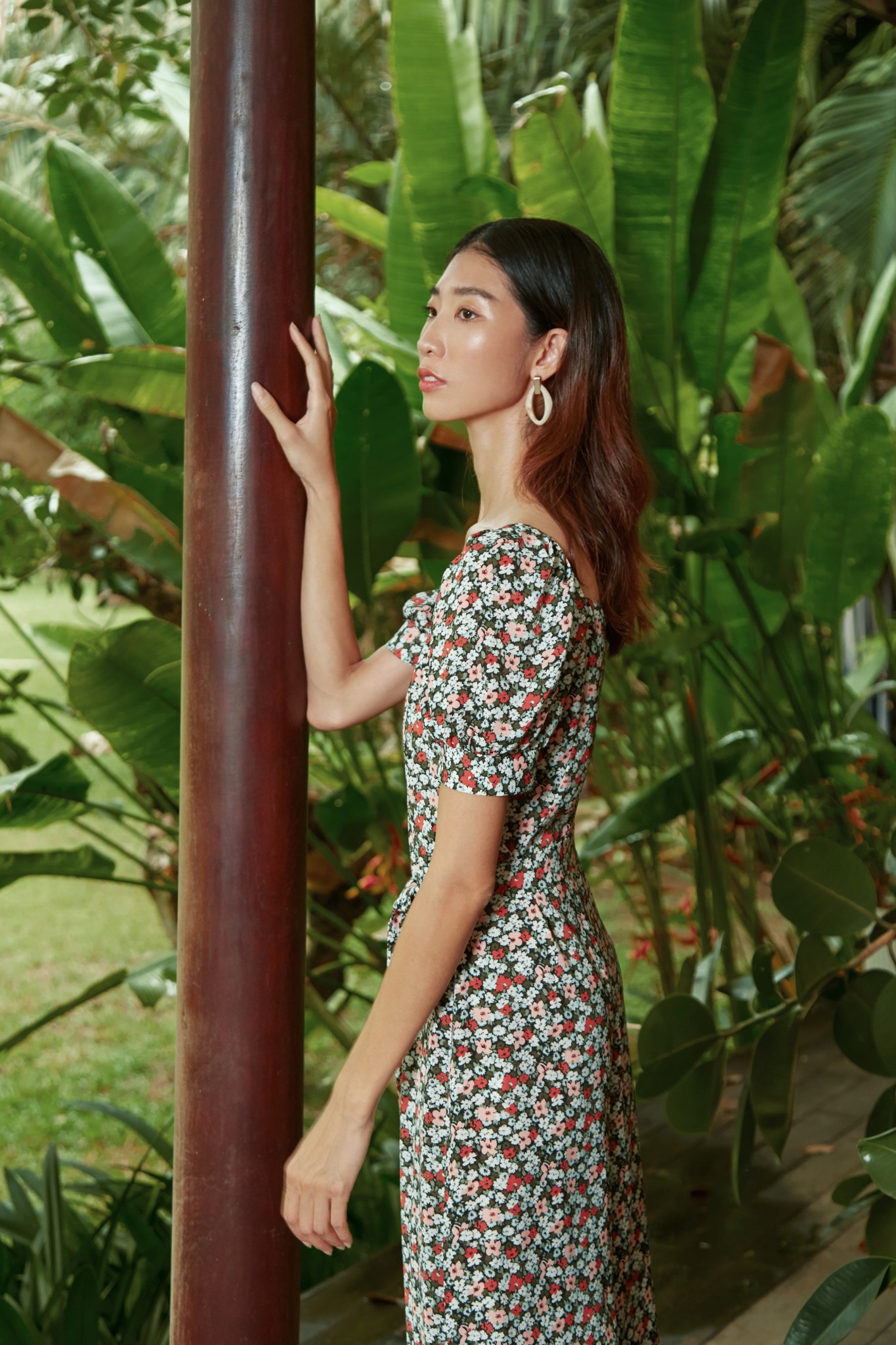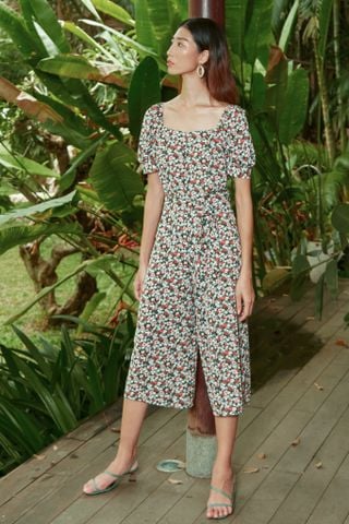 Jumpsuit dáng lửng, chiết eo, cổ vuông, tay ngắn phồng, khóa kéo lưng, không túi
