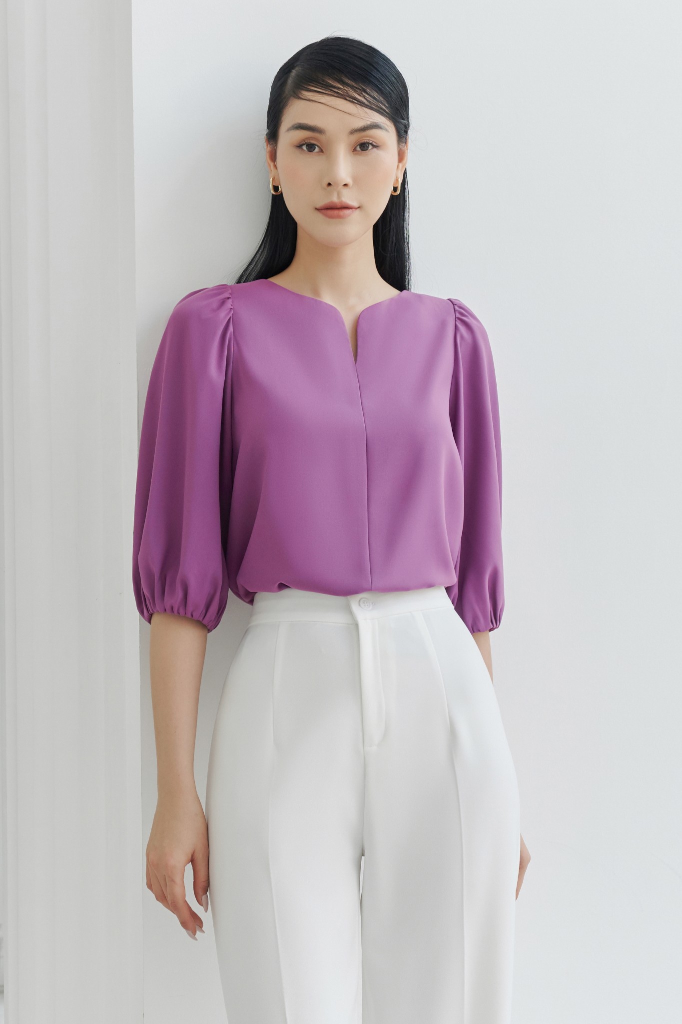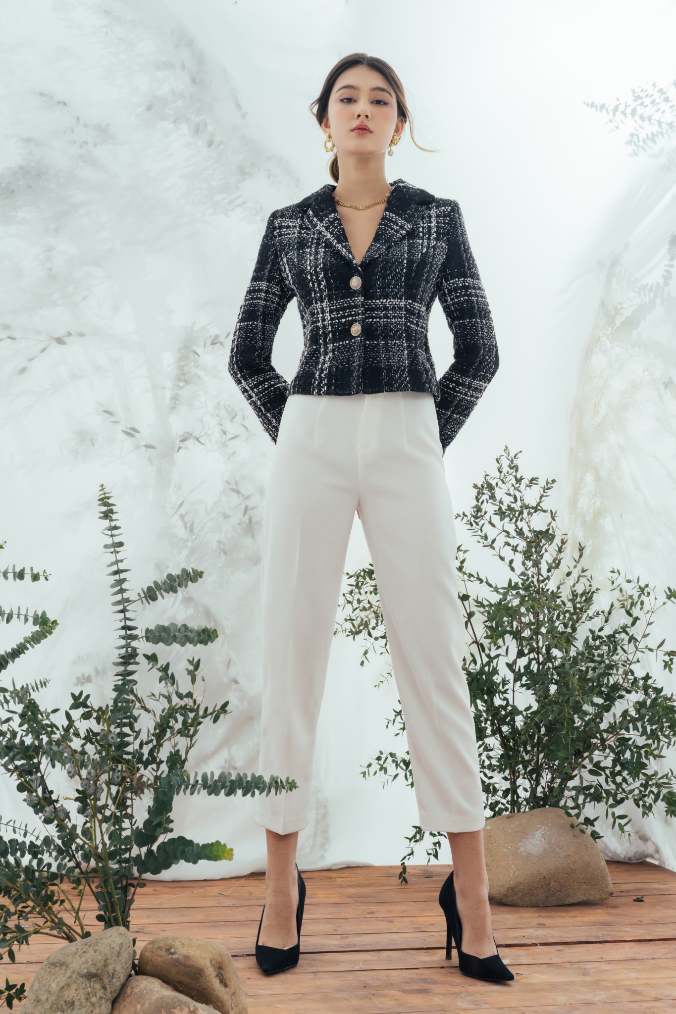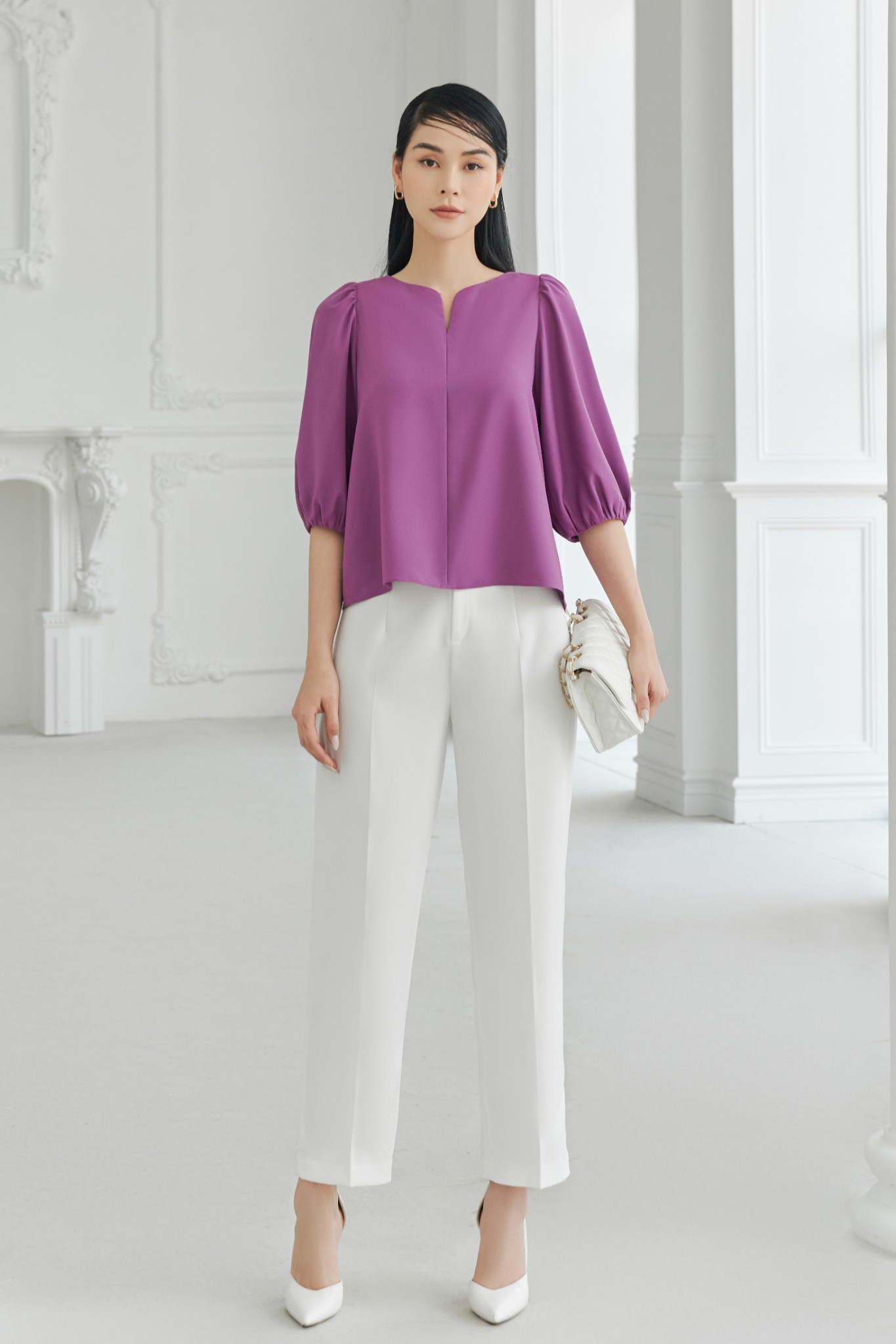 * Kiểu dáng: Quần cạp cao, dáng dài lửng, ống ôm nhẹ, khóa kéo và nút cài trước, không túi