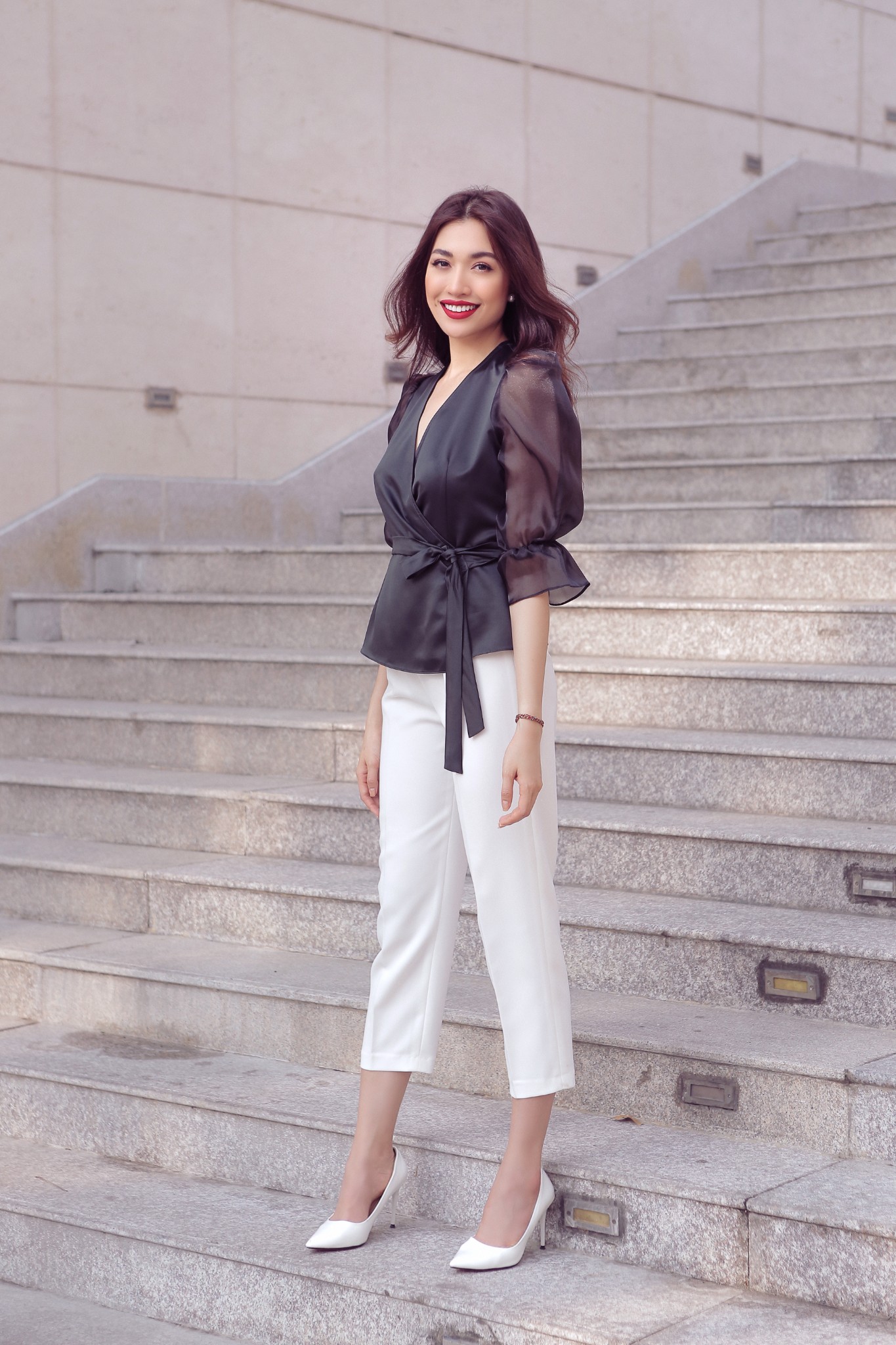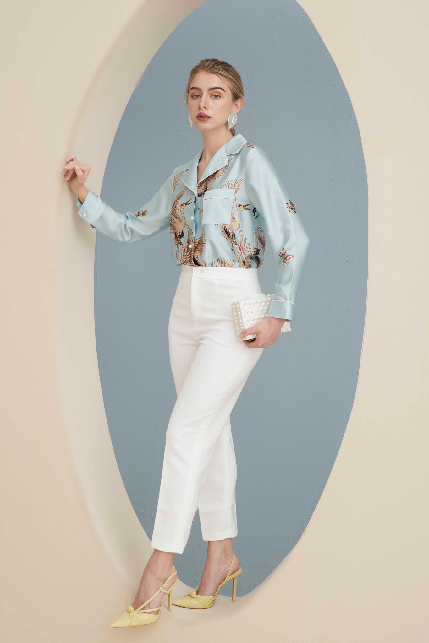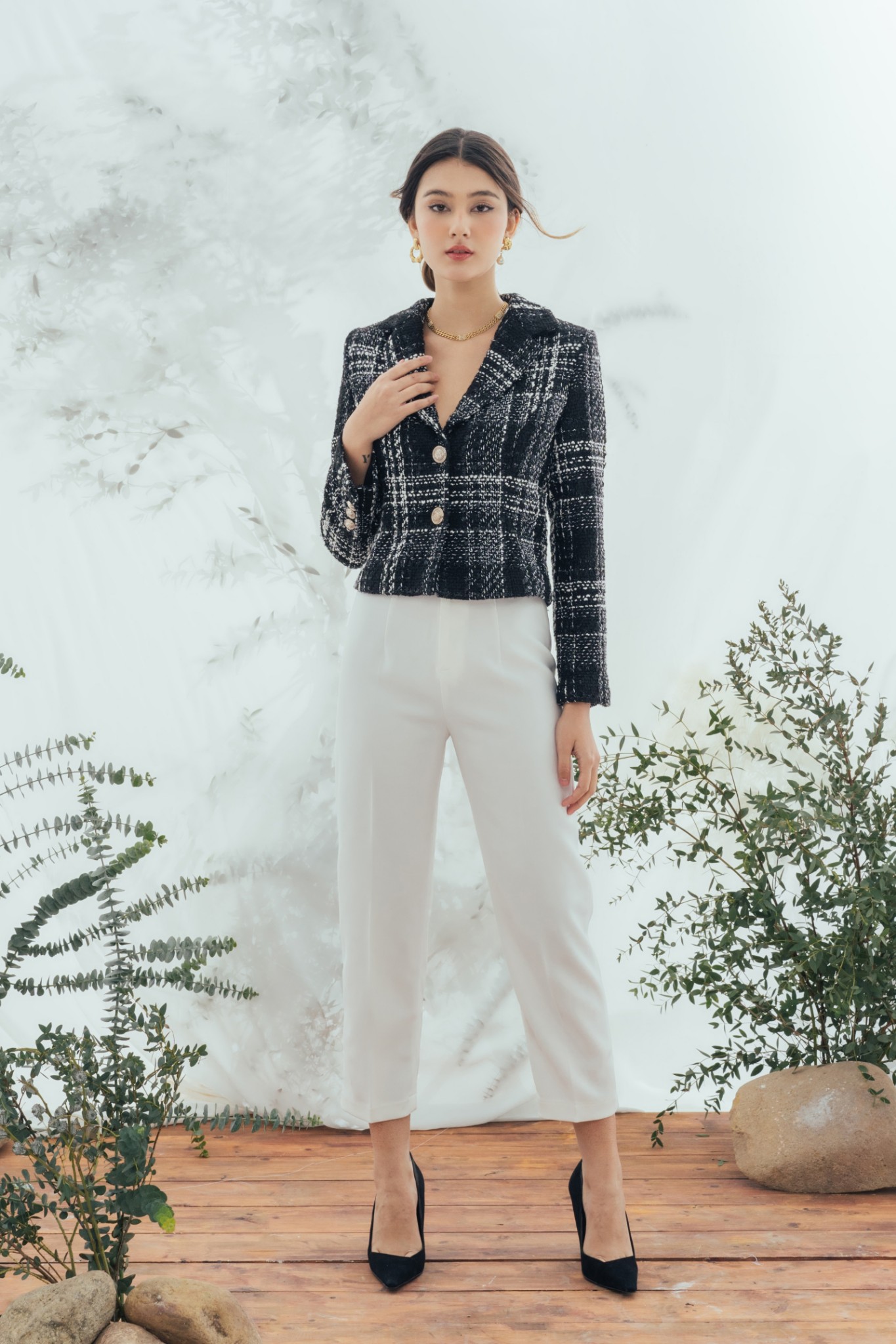 * Kiểu dáng: Quần cạp cao, dáng dài lửng, ống ôm nhẹ, khóa kéo và nút cài trước, không túi