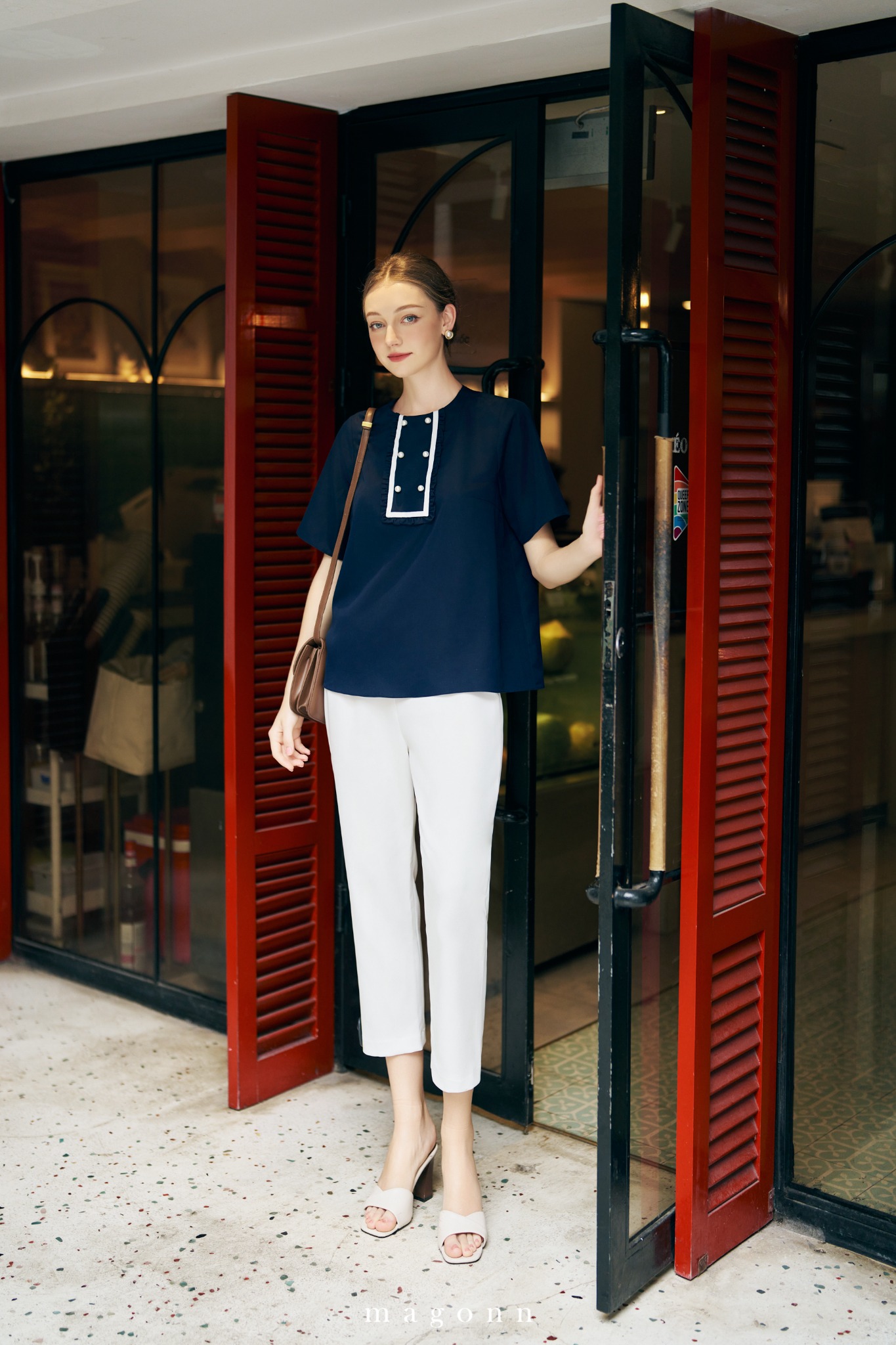 Quần ống ôm, dáng lửng, cạp cao, khóa kéo lưng, không túi